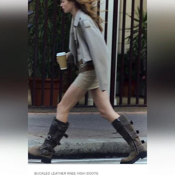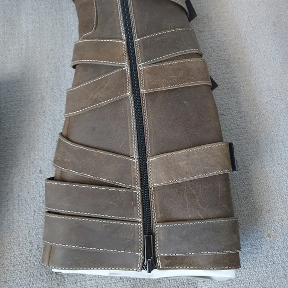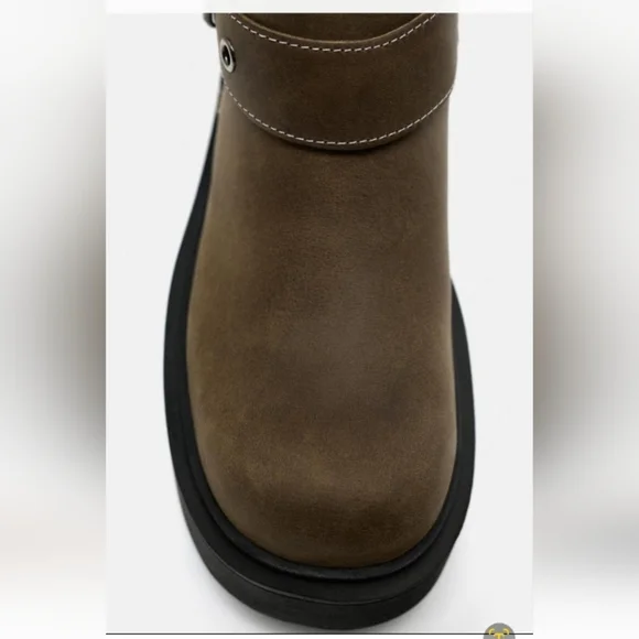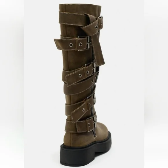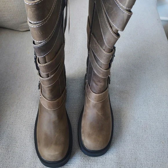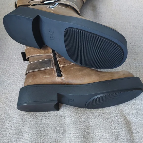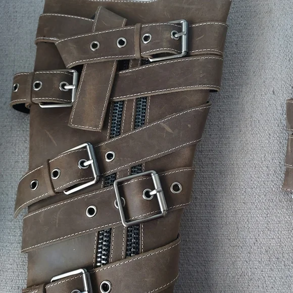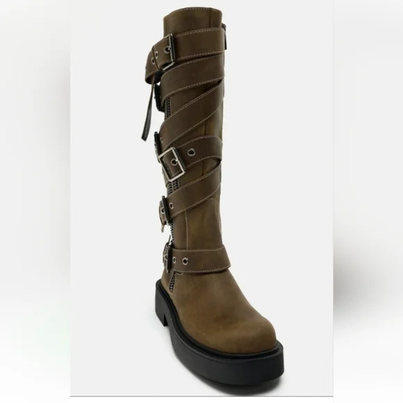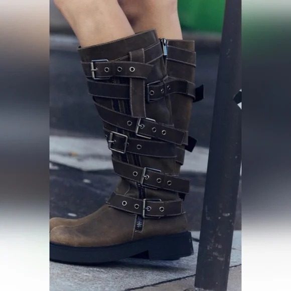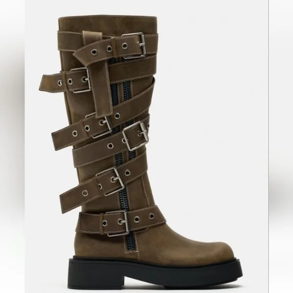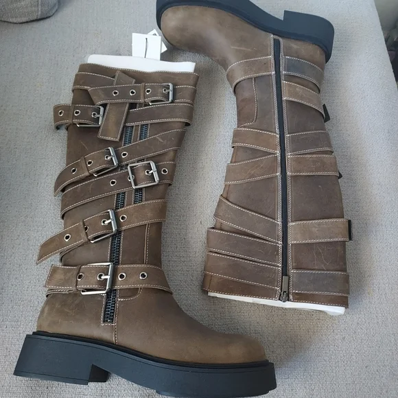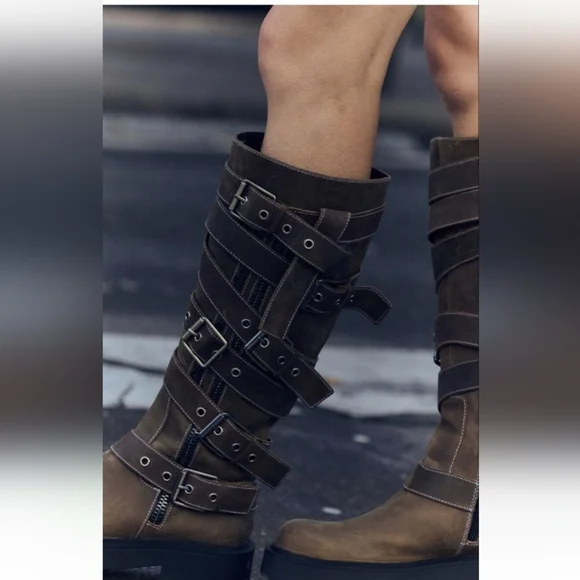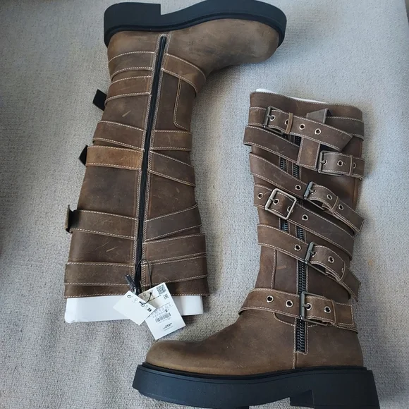 knee-high leather boots wide straps with metal bucklesside zip closure distressed leather chunky sole 10/41new with tags minor scuffs see all pictures