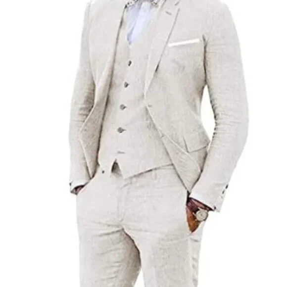 3 Piece Linen Suit - Ivory Mens Suit - Vested summer SuitButton ClosureNotch LapelSingle BreastedSlim Fit70% Rayon, 30% LinenOne Chest PocketTwo Flap Front PocketColor: Ivory