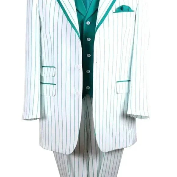 This Suit is the perfect suit for a barbershop quartet3 Button closureNotch LapelTicket PocketPleated PantsShiny Pinstripe and Lapel TrimColor : Turquoise