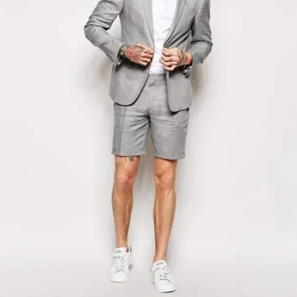 Linen For Beach Wedding outfit Fabric Summer Business Grey Suits With Shorts Pants Set2 ButtonSingle BreastedNotch LapelSlim FitShort PantMaterial: Linen,Cotton,WoolColor: Grey