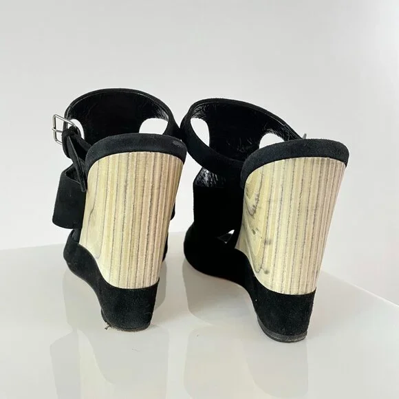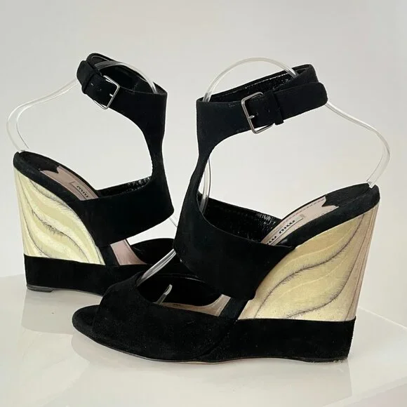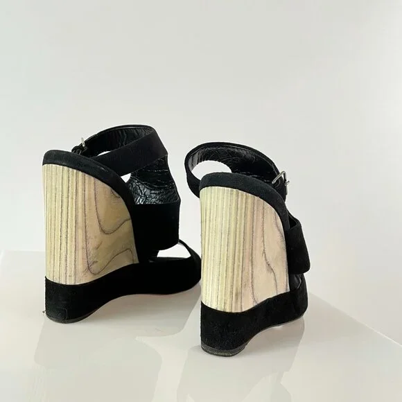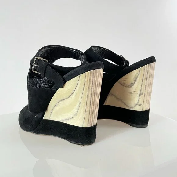 After doing some research, I believe these stunning black suede and grain exposed wooden wedges are from the 2013 Miu Miu season.It was the season in which they featured their...