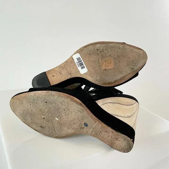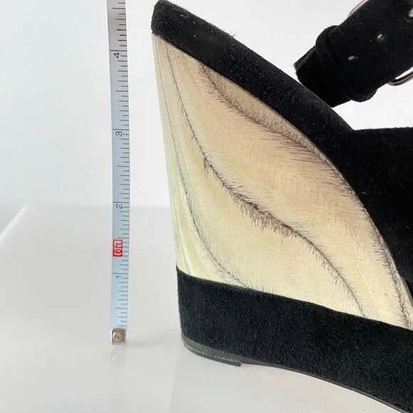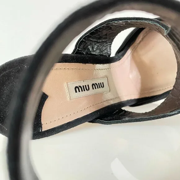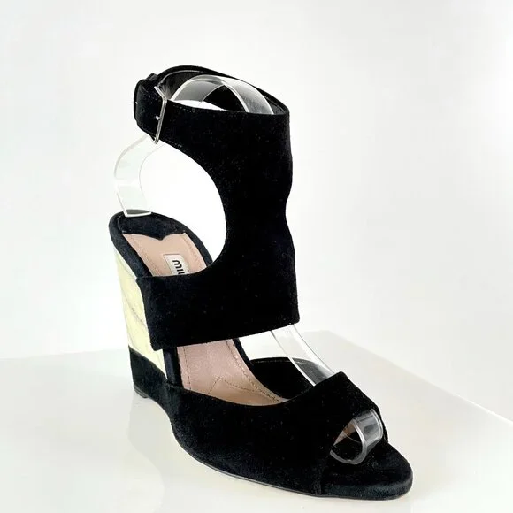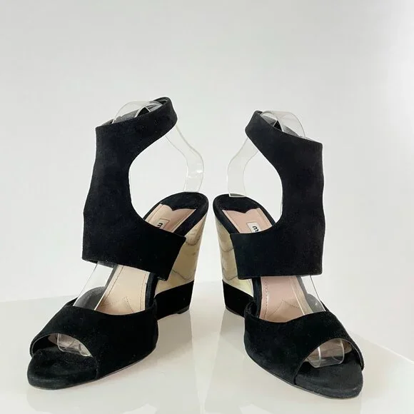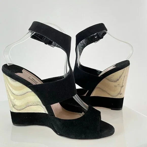 After doing some research, I believe these stunning black suede and grain exposed wooden wedges are from the 2013 Miu Miu season.It was the season in which they featured their shibori dye techniques and many high end designers were showcasing a wedge silhouette (which is always on trend).These Miu Miu’s stand out for their bottom suede detailing, gorgeous materials, marbleized wood grain (imagine how they had to plan that heel to get the grain to look just so!), and t-strap/cut out top, which is so flattering. Truly worth of any avid shoe collection!SKU|4350BRAND|Miu MiuSEASON|2013 (estimate)SIZE|38 (US 7.5-8)FIT| true to sizeMATERIAL|wood with suede upperCONDITION|Very Gently Used – Light to moderate scuffs throughout. No damage to exterior or interior. Sticker residue from size or price sticker at insole/outsole. Near full life left to shoe. Photos are part of condition description.BUNDLE & SAVE!|Get the most out of shipping by bundling with other closet gems! Will consider all offers!RETURN POLICY|Shoes need to be just right. Refer to the description for insight on how the sizing of the manufacturer runs.If you purchase a pair and experience discomfort or sizing issues, I will entertain all requested returns within 48 hours of receipt of delivery (according to the tracking number). Items must show no signs of additional wear and match the original description/photos.