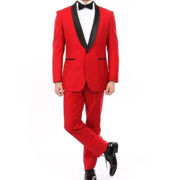 "This modern fit single breasted tuxedo features a one button closure, black satin shawl lapel, and side vents. The pants are flat front and made from 100% wool. The pants come six inches smaller than the jacket size and can be adjusted out two inches or in four inches by a tailor. The pant length is unfinished for custom hemming."