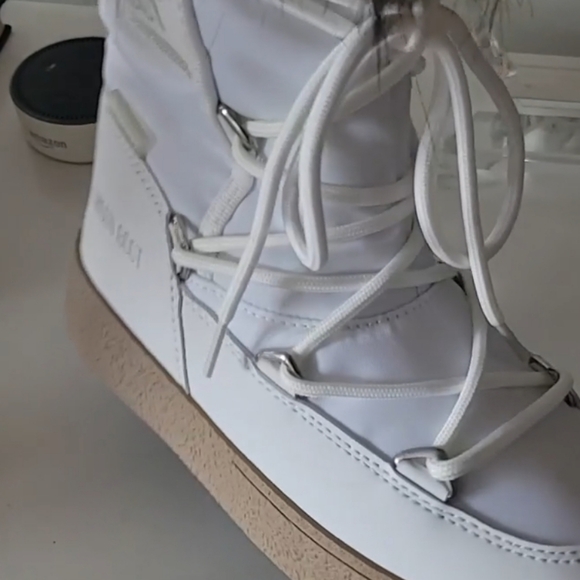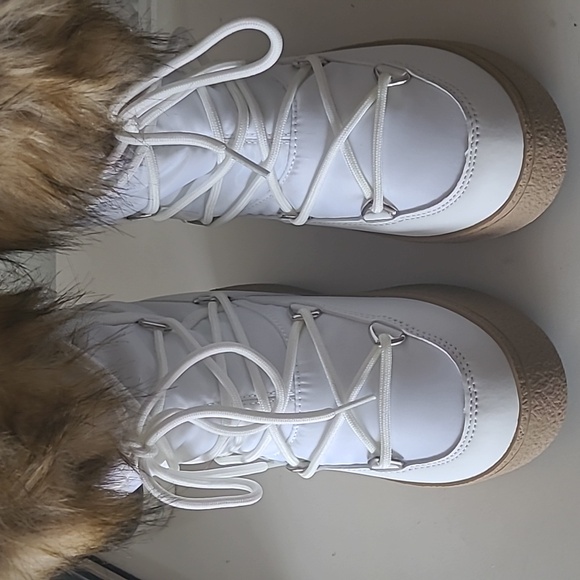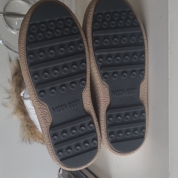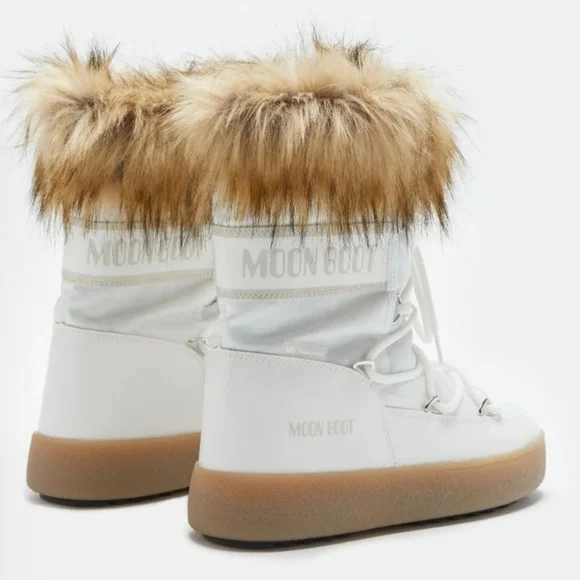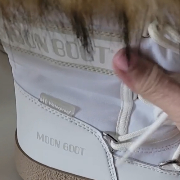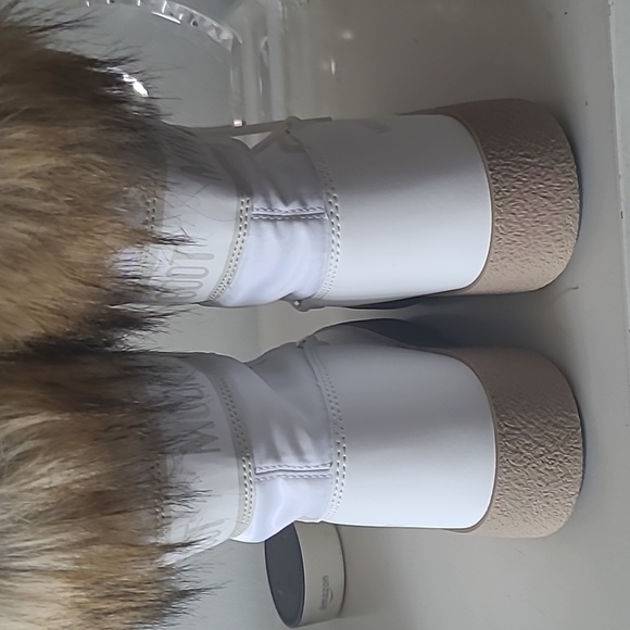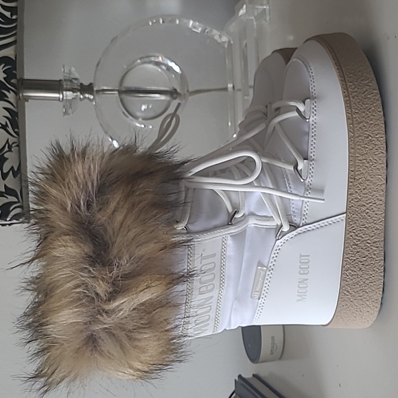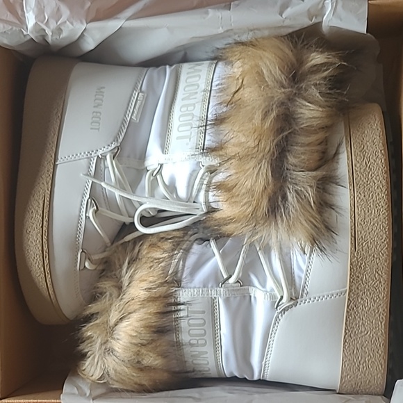 Brand new in box white Moon Boot with camel faux fur trim.INSULATED & 100% WATER-REPELLENT winter snow boots with soft faux fur collars that keep feet warm and dry on cold, snowy daysRUBBER TREAD SOLE WITH SUCTION PADS give these unisex winter boots serious ground control, keeping you on your feet in icy conditionsEASY-ON & AMBIDEXTROUS slip-on boots perfect for exploring the slopes in styleLIGHTWEIGHT thermoplastic midsole, PVC heel counter counter and trim, and drawstring at the top ensure these winter boots for women and men provide all-day comfort on your feet and a secure fit, keeping cold, snow, and debris from entering your bootsICON MOON BOOT SIZING: 5 Things To KnowIcon Moon Boots are multi-sized... clever, right? Here’s how the technology works, and what you need to know to find the perfect fit.What is multi-sizing?Tired of working out whether your feet are an EU 38, 38.5 or 39? We’ve made things easy. Each pair of Icon Moon Boots spans a range of sizes, so you can shop with confidence and be sure you’re choosing the best pair for you.The foam lining moulds to the shape of your footPlush, padded and designed to adapt to the size and shape of each foot, the technological foam lining is what makes the Icon Moon Boot so unique. Fun fact: the padding is bigger than the boot itself, so it will feel snug at first but begin to relax after just a few hours of wear.Go bigChoose one size larger than you usually would. Each pair runs a little small.