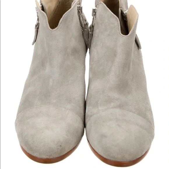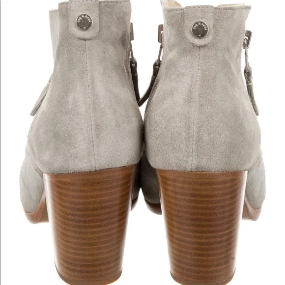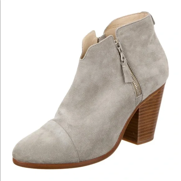 Light grey suede Rag & Bone round-toe ankle boots with tonal stitching throughout, stacked heels and dual zip closures at uppers. Includes dust bag.