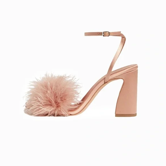 High, block-heel sandal from Loeffler Randall with a single-band upper in blush satin with feather detailing. Features an adjustable ankle strap and an open toe.• Upper: 72%...