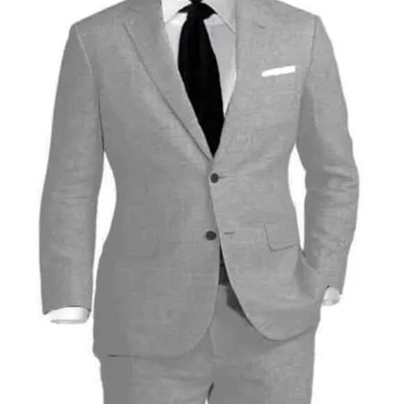 Two Button Grey Linen For Beach Wedding outfit SuitTwo ButtonSpread Notch LapelSingle BreastedOne Chest PocketFlap Front PocketsFour Button CuffMaterial: LinenColor: Grey