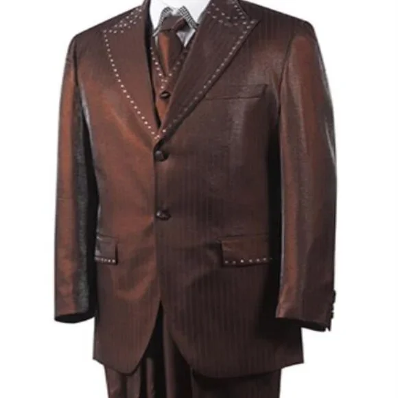 Two Button Unique 3 Piece Men´s Brown Trimmed Pleated Pants Vested Suits Fashion Tuxedo For MenPoly-Nylon Semi-Sheen Suit with Rhinestone DesignMatching TieAvailable Color : BrownThis item is ideal for weddings, proms, black tie, business and other formal events.