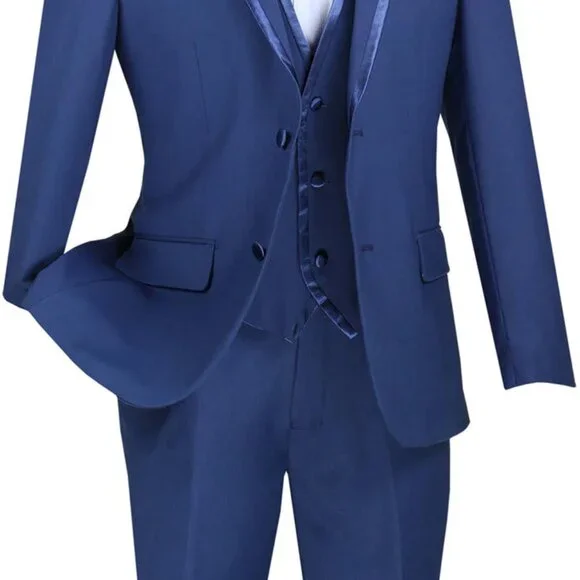 Groomsmen Tuxedo - Groom Tuxedo - Wedding Tuxedo in Blue or Blue or Burgundy or Red or White or 10 Other colorsSlim Fit 3 Piece Suit including Jacket, Vest, and PantsSingle-breasted 2 Buttons Side Vents3 Buttons VestFlat Front Pants, Un-hemmed Bottoms for Alteration EaseTextured SolidThe Accessories Pictured are NOT Included. Display Purposes Only.