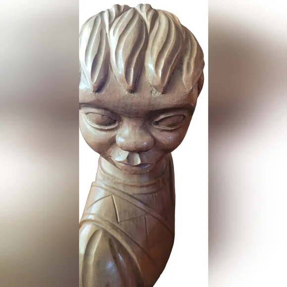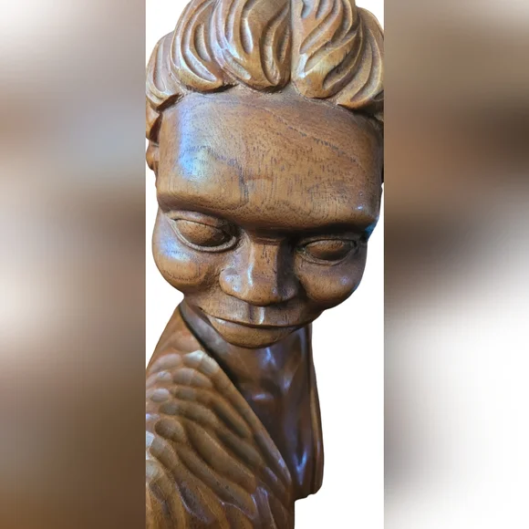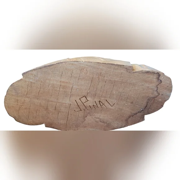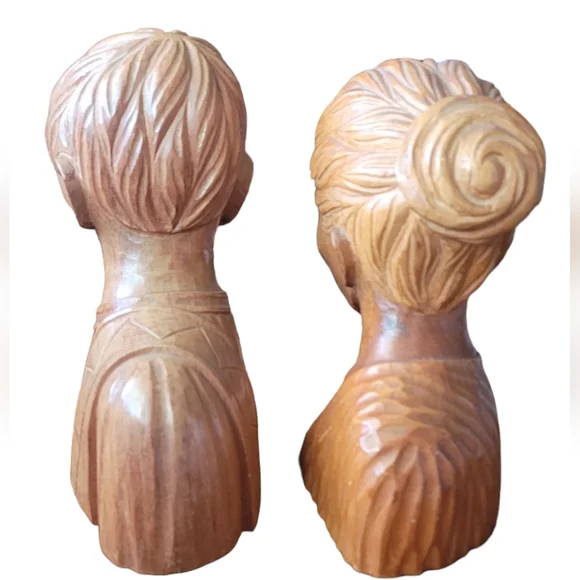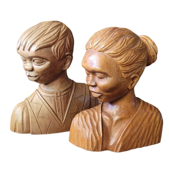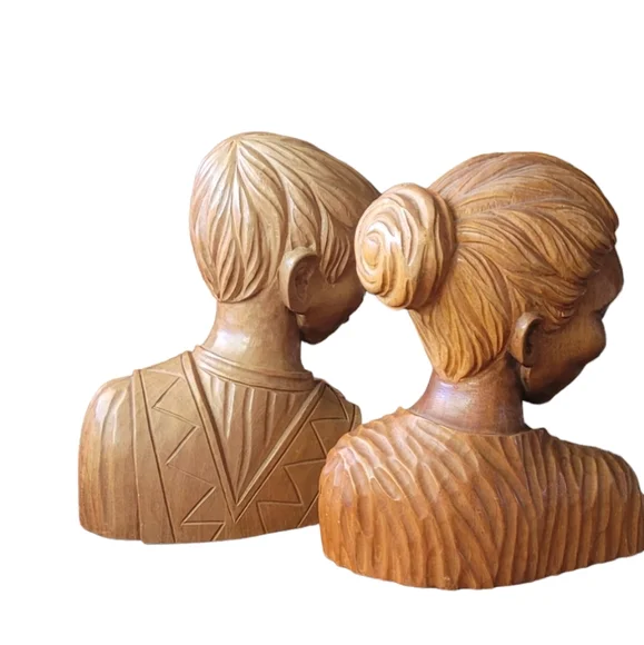 Two vintage José Pinal hand carved wood sculptures. The male is signed. The female is not. Both are in good condition. The male is 9"x8"The female is 9"x7"