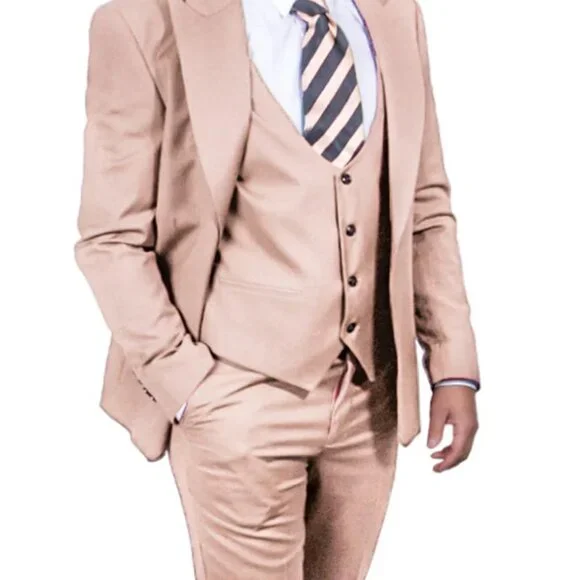 This Tan Suits For Wedding - Tan Groomsmen Suits is perfect for wedding Men´s Vested One Button Peak Lapel Stacy Adams Suit In BeigeThis one button Stacy Adams brand suit features a wide peak lapel, matching semi-scoop vest, side vents, and flat front pants.