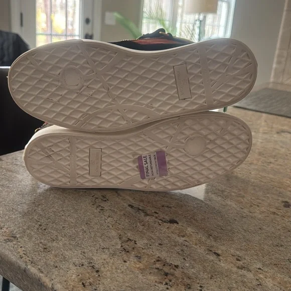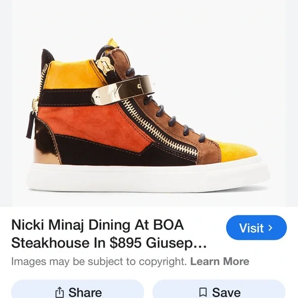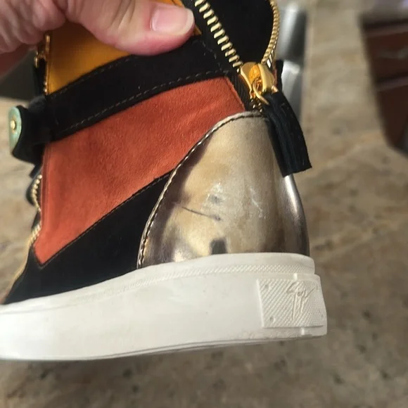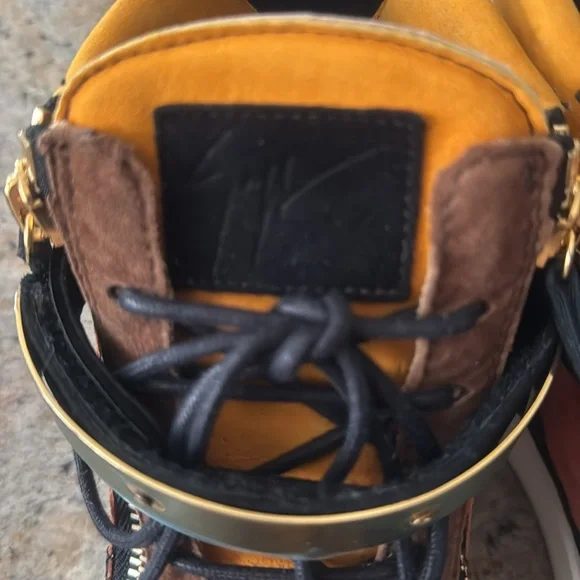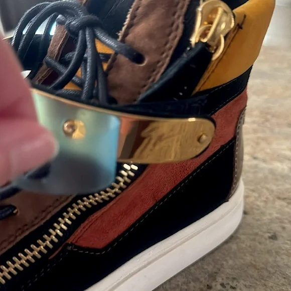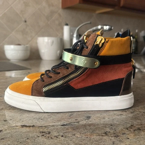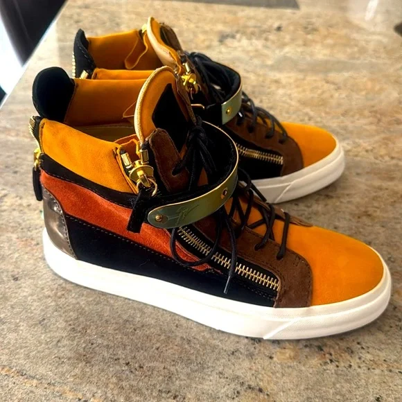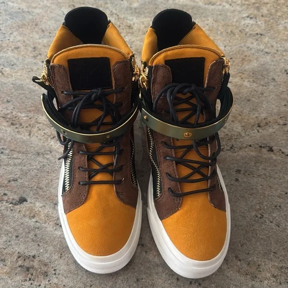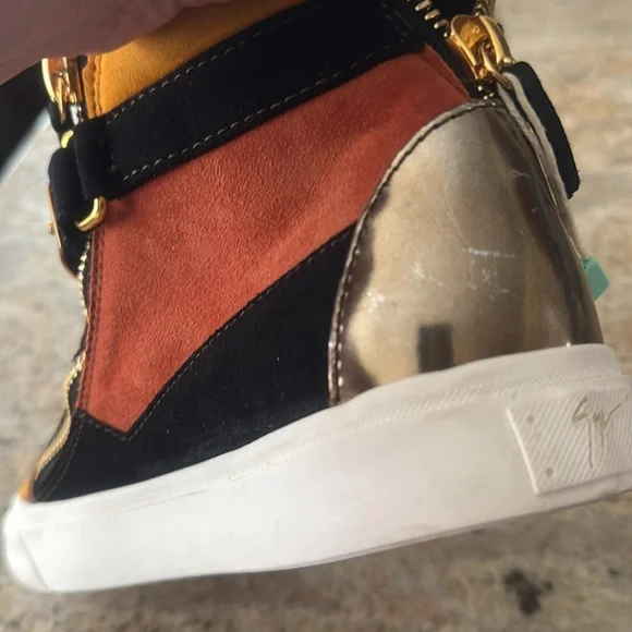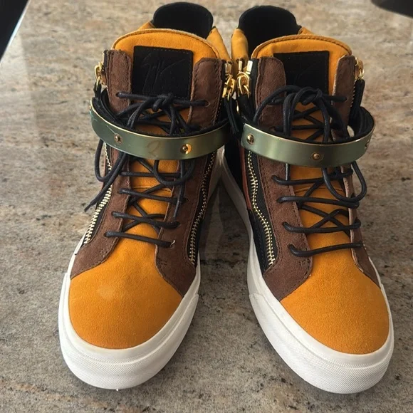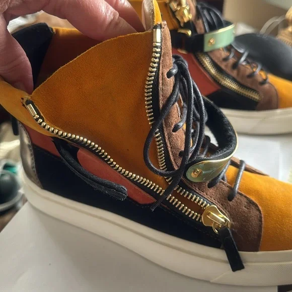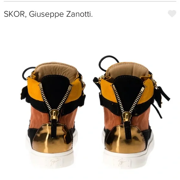 Vibrant SKOR high-top suede sneakers featuring striking gold zippers.MADE BY BUKOWSKIS. The sneakers showcase a mix of brown, rust, and gold colors.Shiny gold front name plate bar still wrapped in plastic.Some rubs on heels from trying on. Metallic heels. Cushion comfort tongue & interior. Size EU 39.Made in Italy.Nicki Minaj faves!Fit like an 8.5 to 9 women’s or 6.5-7 men’s Unisex
