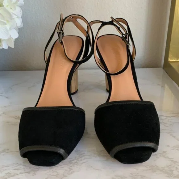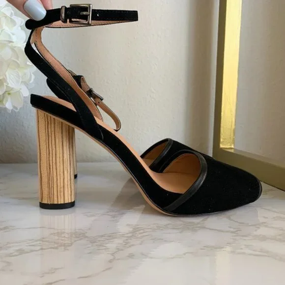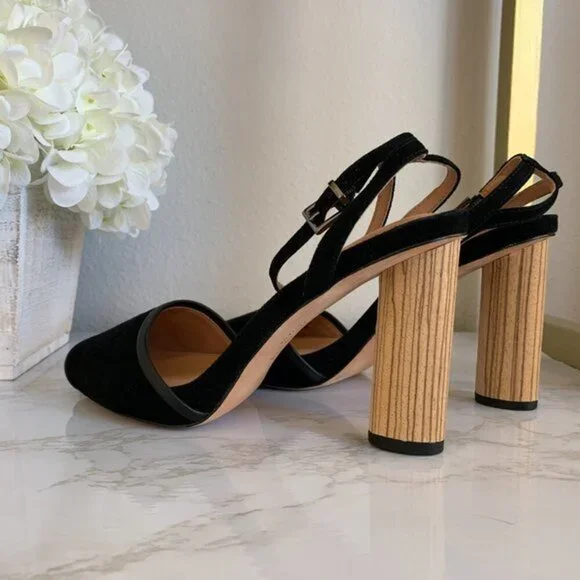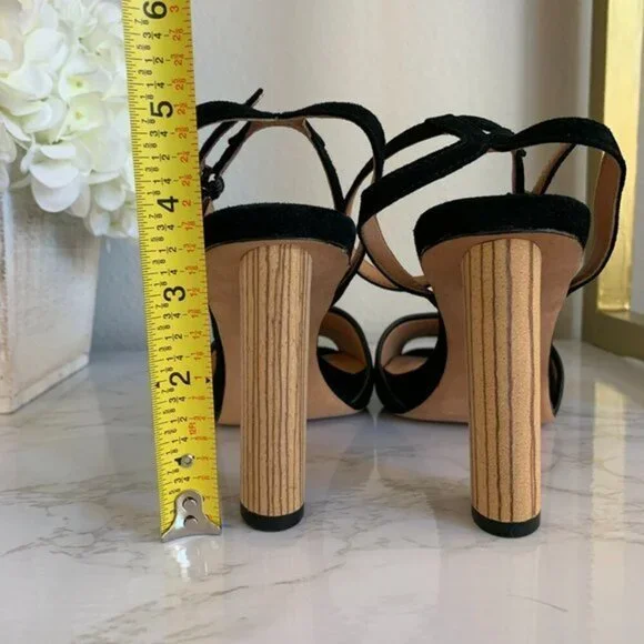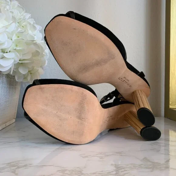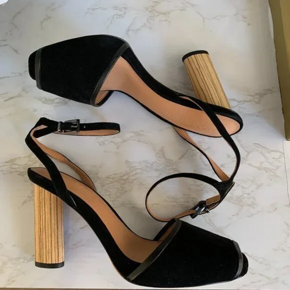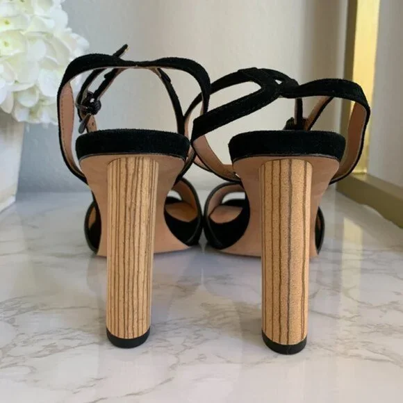 Brand new in box. Smoke free home. Halston Heritage Kathy in Pisa Peep Toe Sandal - black suede and wood. The Kathy peep toe sandal features a slim and secure ankle strap and wide vamp strap with a bold woodgrain striped heel. Leather construction, Adjustable ankle strap with buckle closure, Comfort padded footbed, Woodgrain column heel 3.5". Size 6. Retail $358.