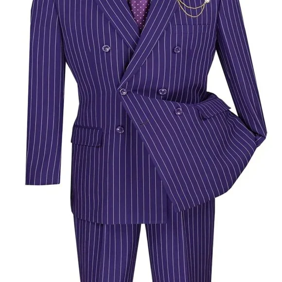 1920s Mens Suit - 1920s Mens Outfit - 1920s costume Bold Pinstripe Wide Suit in PurpleThis classic double breasted suit features a wide bold , peak lapel, side vents, and matching pleated pants. This is the perfect suit for any flapper,1920´s, 1930´s, mobster, party, swing dance, or costume party. The suit is construction in a very high quality fabric.