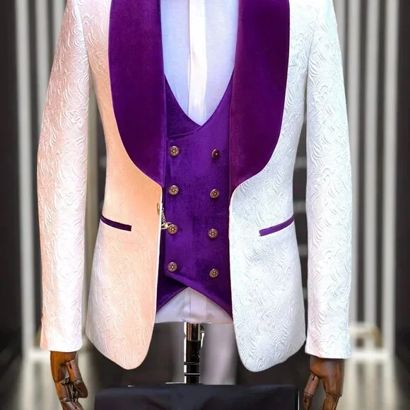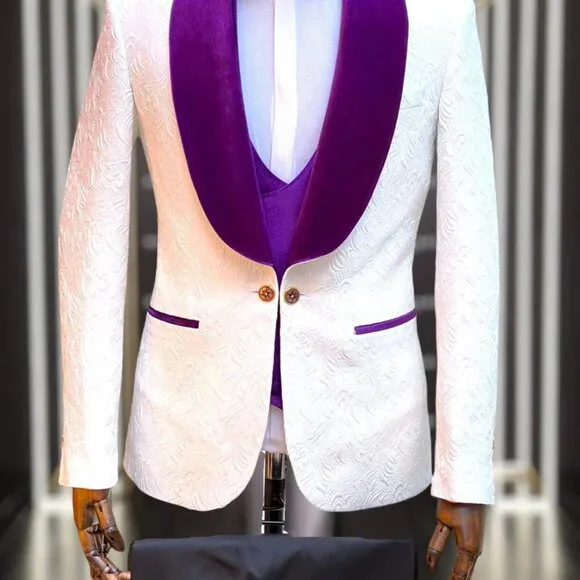 Marco Lorenzo Premium Paisley Purple Velvet 4pc Suit W/ Matching BowtieSlim Fit1 ButtonVelvet Shawl CollarImported Turkish Fabric2 VentsFully linedBlack Slim fit, flat front trousers with zipper closureOuter and Inner Pockets Wool and Viscose Blend Construction