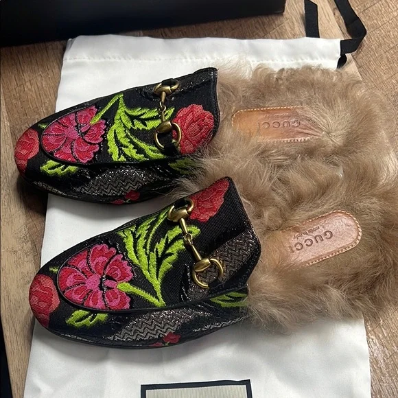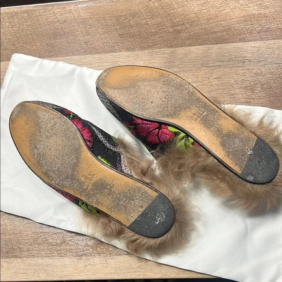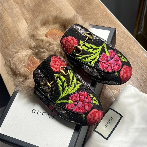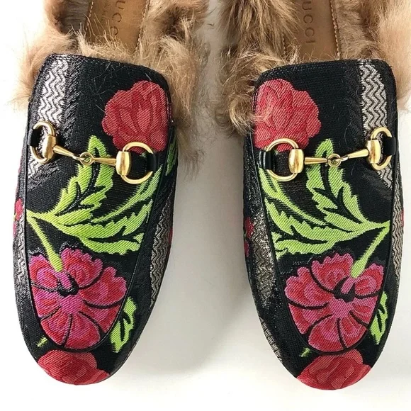Tapestry Brocade Fur Lined Princetown Mules Slip On Flatsorder (A3)