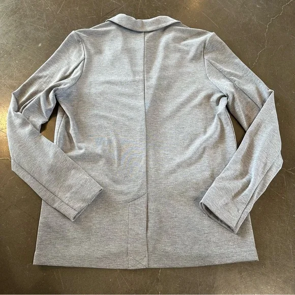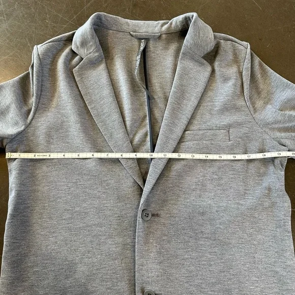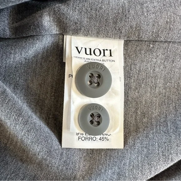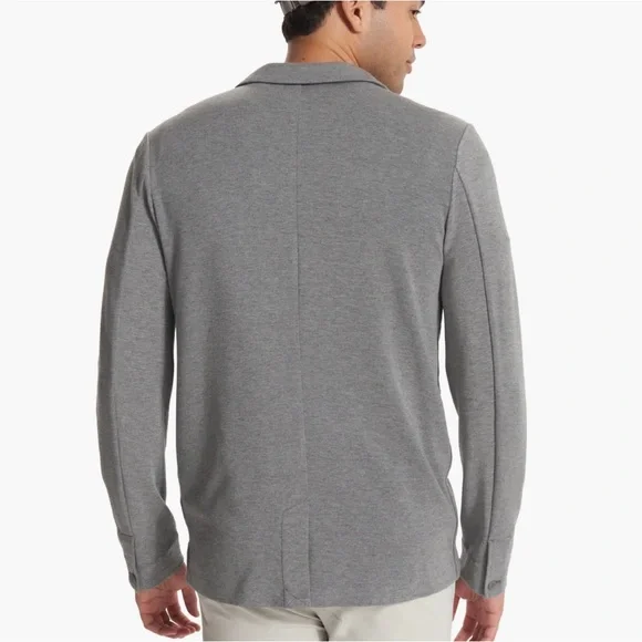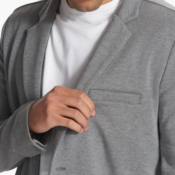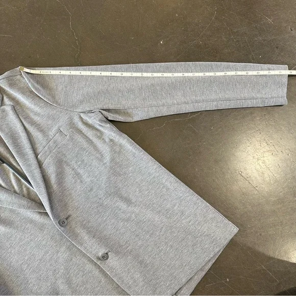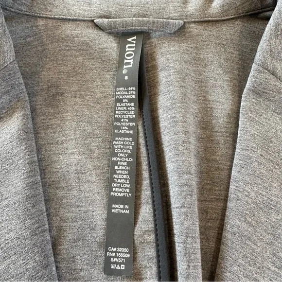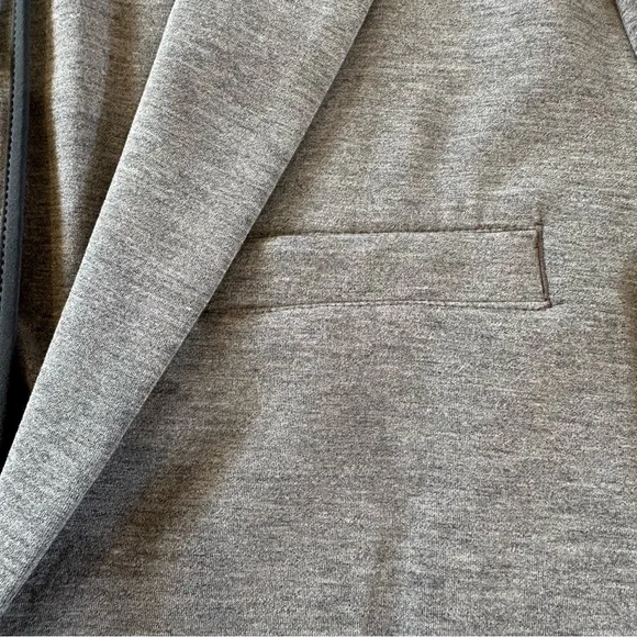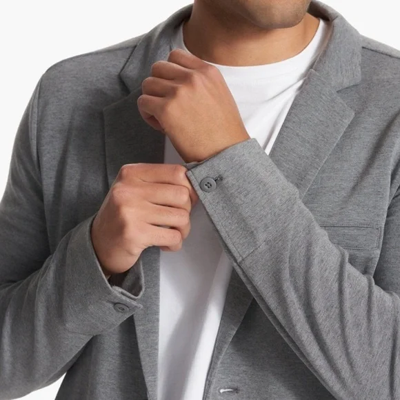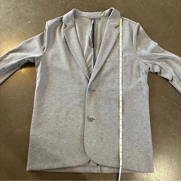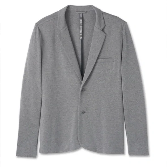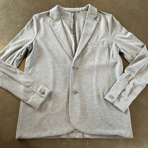 Looks like a blazer, wears like a tee. Made with a soft and stylish double knit jersey, this Vuori “Vail” blazer elevates basics and combines tailored sophistication with the brand´s signature comfort and performance. Designed for versatility, this modern blazer is crafted from a premium performance stretch fabric that moves with you while maintaining a sharp, structured silhouette. Lightweight, breathable, and wrinkle-resistant, the Vail Blazer effortlessly blends polish with all-day ease.—Welt Pocket (non-functional)—Button Cuff—Back Vent—2 buttons at front—Button cuff—Color:Heather Grey—Size:Small—Fabrication:Shell:64% Modal27% Polyamide 9% ElastaneLiner:45% Recycled Polyester 41% Polyester 14% Elastane—Condition: Unworn, new without tags. Small dot mark on interior brand label, but not visible from exterior. Smoke-free, pet-free home. All garments are steamed and sanitized using my LG Steam Styler Closet. As always, condition is subjective so please kindly note photos and videos. Additional images available upon request.—Measurements:Please see photos for approximate measurements - additional available upon request.—Photography:Item colors may vary slightly, contingent upon lighting, flash, time of day, depth or closeness of shot.