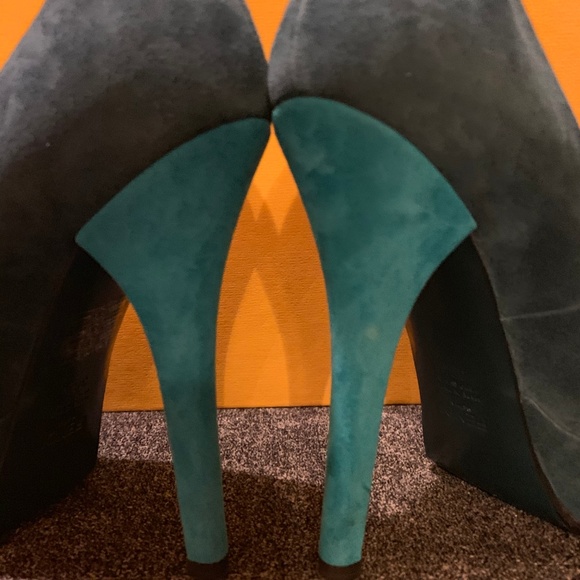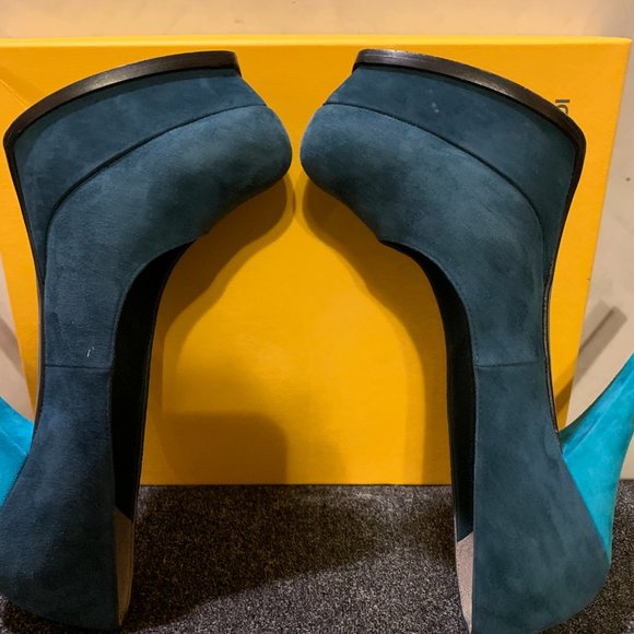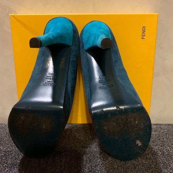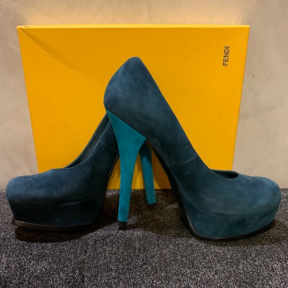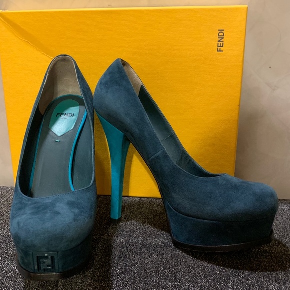 Excellent ConditionTeal suede Fendi round-toe pumps with tonal covered platforms featuring engraved Zucca embellishments and turquoise suede at heels. Includes original box.Heels:...