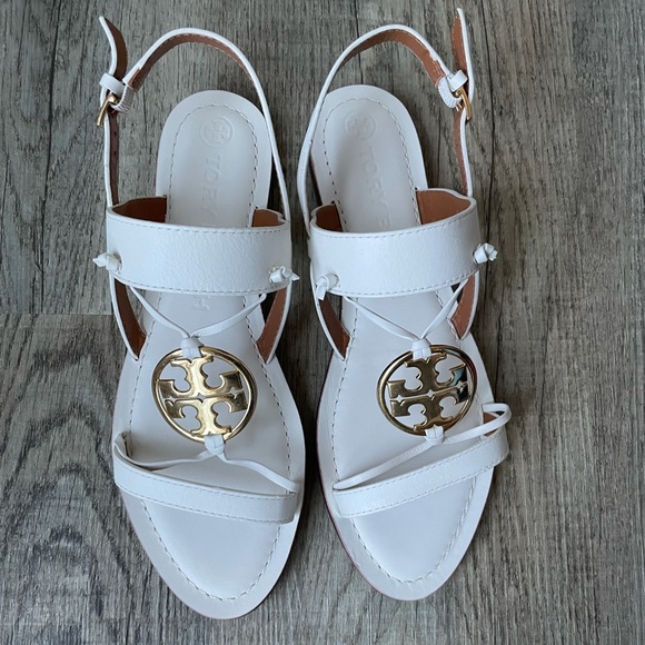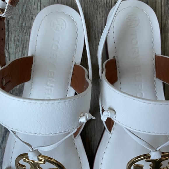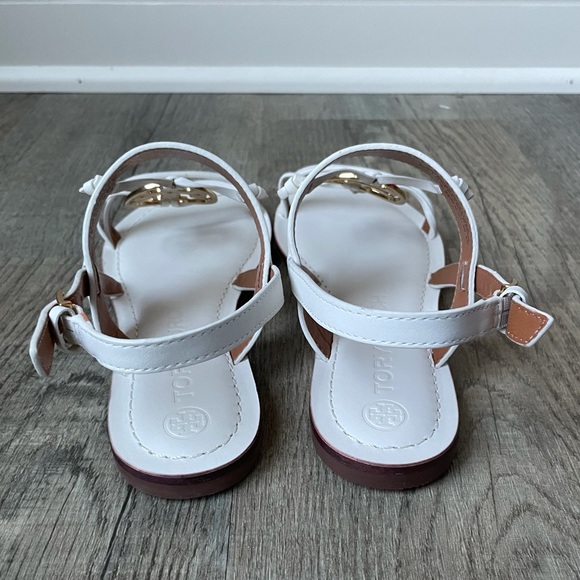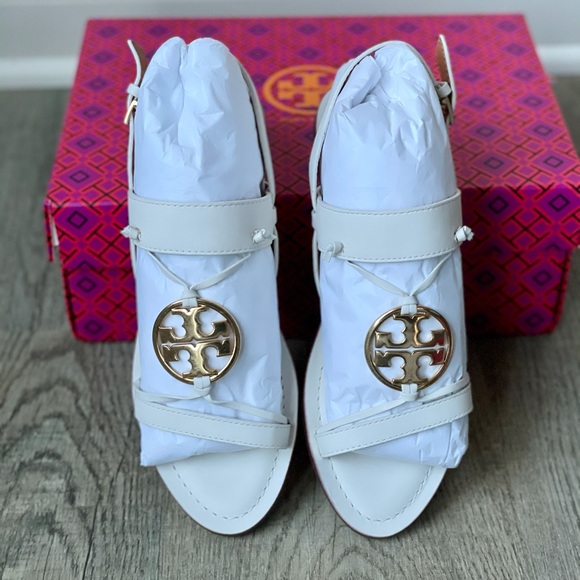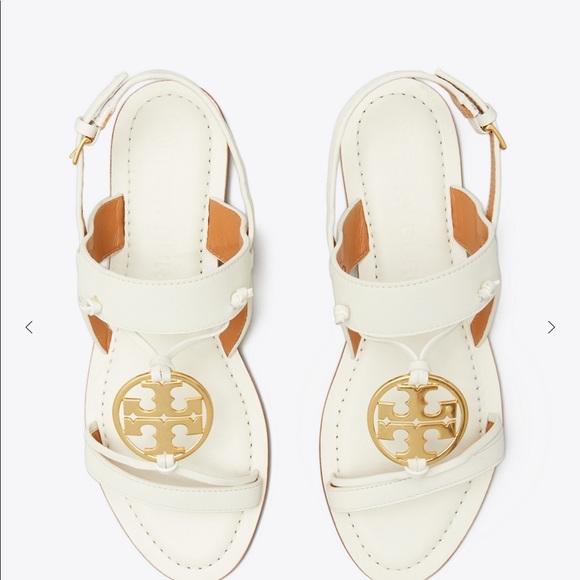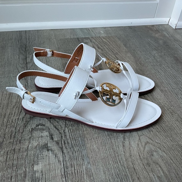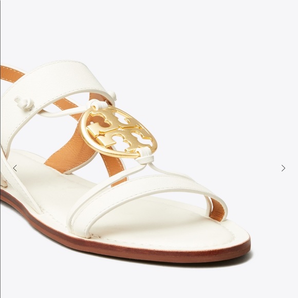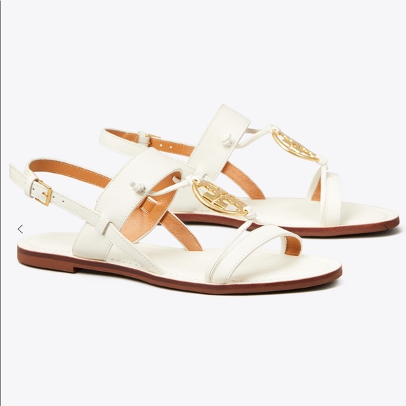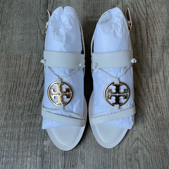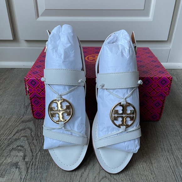 New in box comes with dust bag. Size 8. Runs small size up. White - bleach color A two-band style, crafted in finely milled leather. It features a metal-topped double ‘T’, held in place by knotted leather ties, and a buckled slingback strap positioned for a secure and comfortable fit.* 0.2" (5 mm) heel* Milled calfskin upper* Chromium-free napa leather lining* Buckled ankle strap* Rubber sole