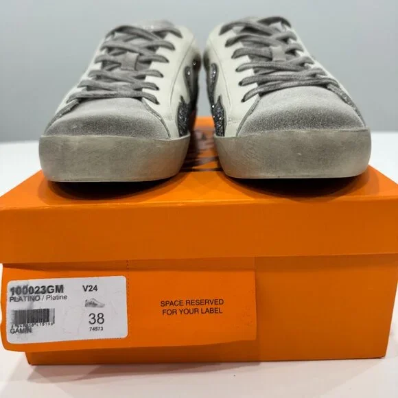 Silver GlitterI´m Size 38.5-39 or 8.5 it´s perfect on me.Inside almost 10", Outside 10.3" See Pictures.Bibi Lou sneakersmade of white leather with silver glitter side details and gold on the back.- Adjusted with aged effect drawstring.- Super padded interior insole of approx. 4cm and white leather linings. Excellent New with box and dust bag.Item ships out within 24 hours.