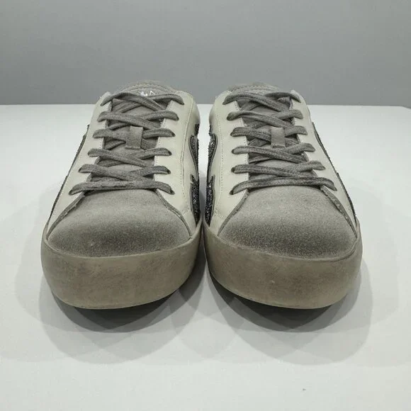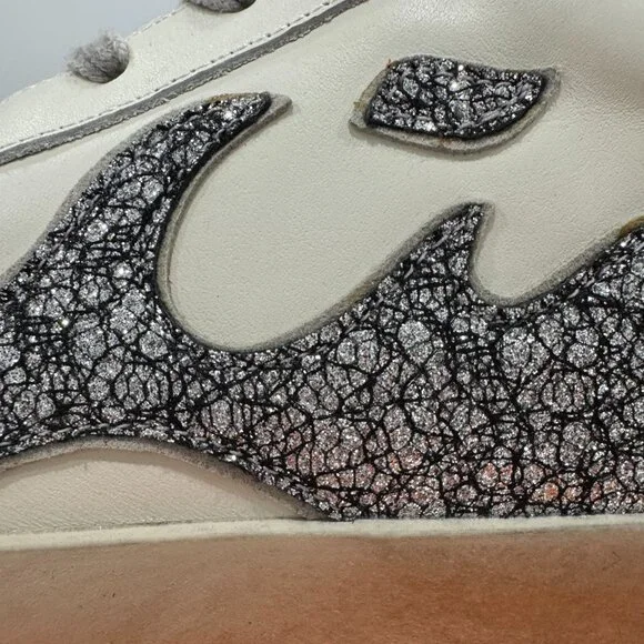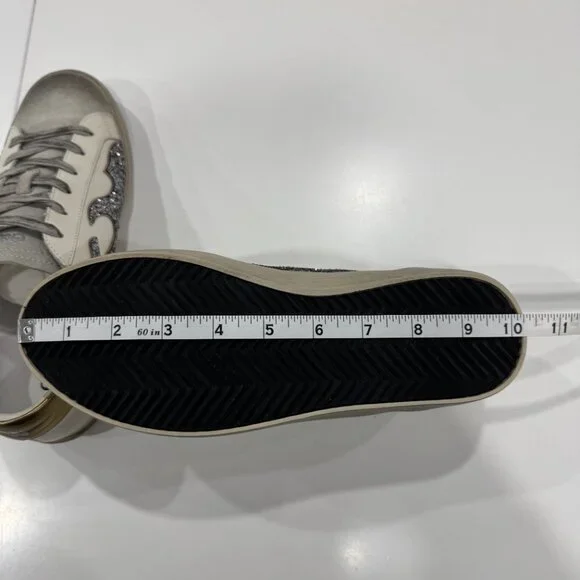 Silver GlitterI´m Size 38.5-39 or 8.5 it´s perfect on me.Inside almost 10", Outside 10.3" See Pictures.Bibi Lou sneakersmade of white leather with silver glitter side...
