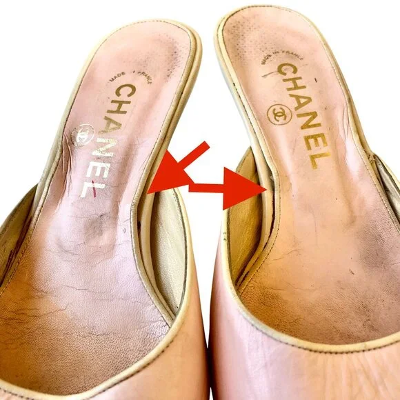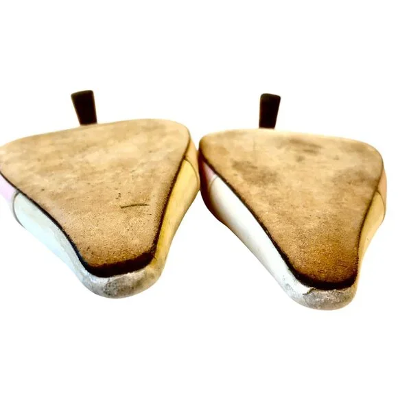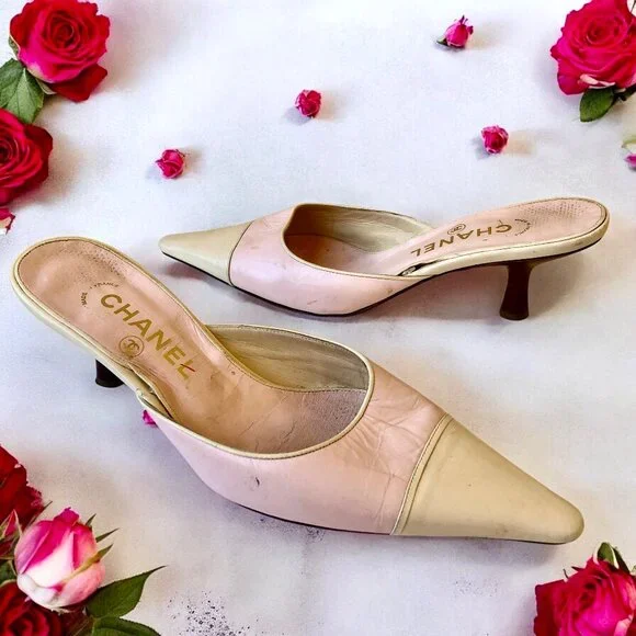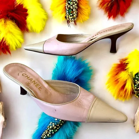 Authetic vintage heels in pale pink with a cream snip toe.Leather lined. Leather outsole.2" wood kitten heel.Made in France.European size:37NOTE - These shoes have been ALTERED.There originally was a slingback strap.There is a hard small bump as shown in photos with arrows where the strap was cut off.The uppers have some creasing and the souls have wear under the toes.Please views all photos. Selling ´as is´.