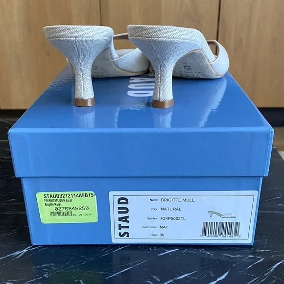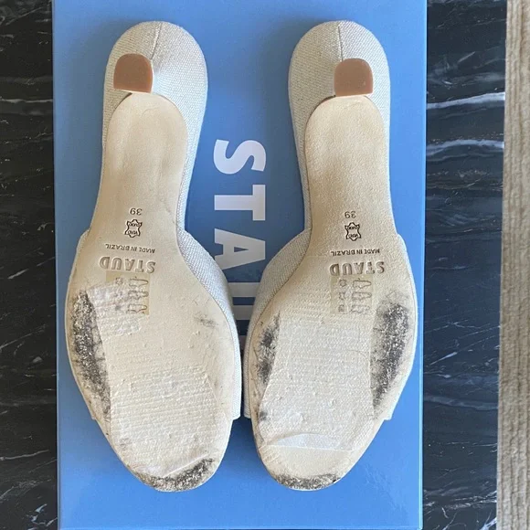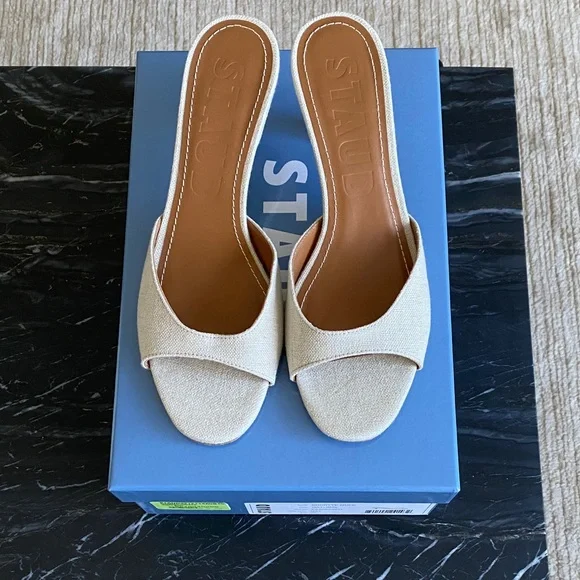 Chic cream mules by STAUD. Perfect for versatile styling. Only worn once is almost perfect condition minus minimal wear on sole. Original shoe box and dust bag included. Women’s size 39 fits like an 8/8.5Upper: LinenLightly padded footbed2.25 inch Kitten heelLeather sole with rubber heel capImported, BrazilThis item cannot be gift-boxed