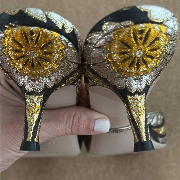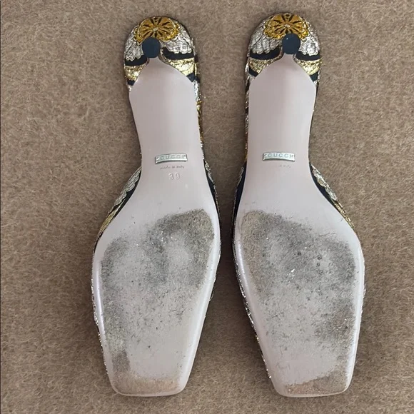 These mules showcase a sophisticated blend of black and gold, offering a luxurious touch to any ensemble. The intricate design and high-quality craftsmanship make them a standout choice for formal occasions. With their sleek silhouette and refined details, these shoes are a testament to timeless elegance.