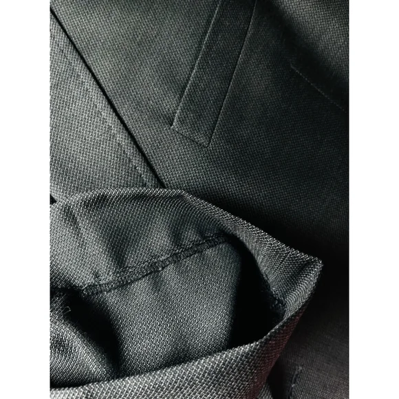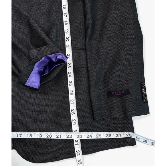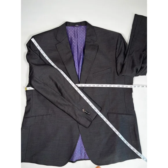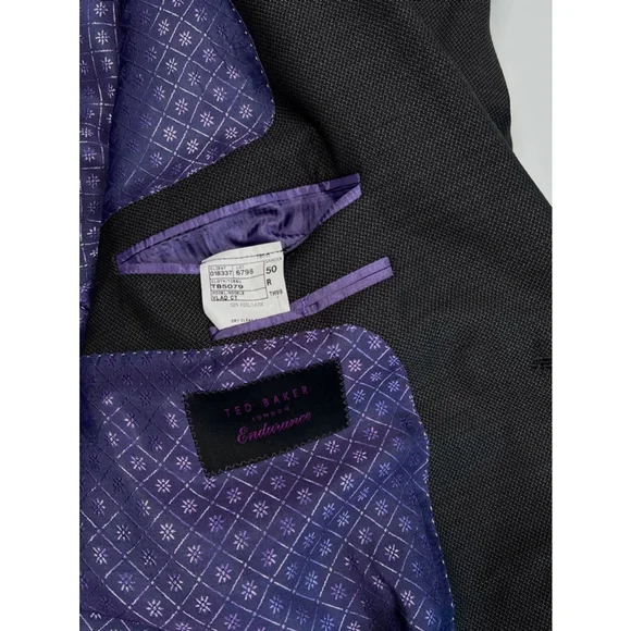 This is a never worn out, no tags, Ted Baker London Endurance suit. Blazer 50RPants 45R, there is some room to make pants longer, see images. Please review all measurements via photos. 100% wool, high quality. The suit is a dark gray color with a subtle textured pattern. The jacket features a two-button closure, notched lapels, and flap pockets. The interior is lined with a purple patterned satin like fabric. The pants are a matching dark gray and have a classic cut. There are no visible stains or tears, but a slight storage wear. No major issues.
