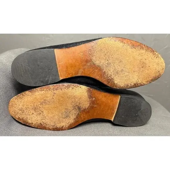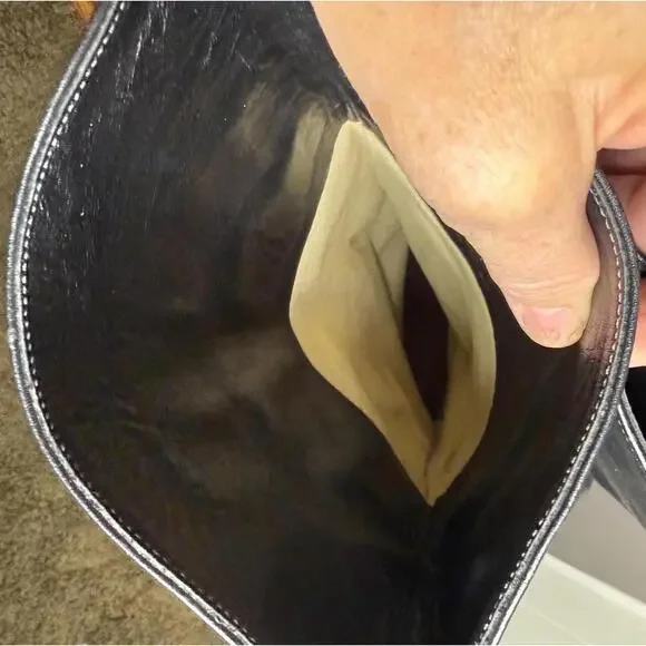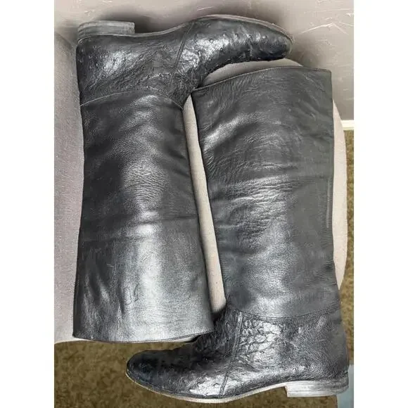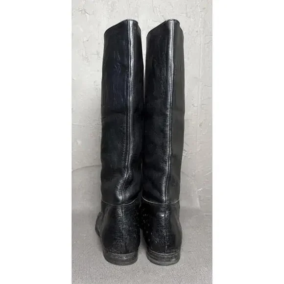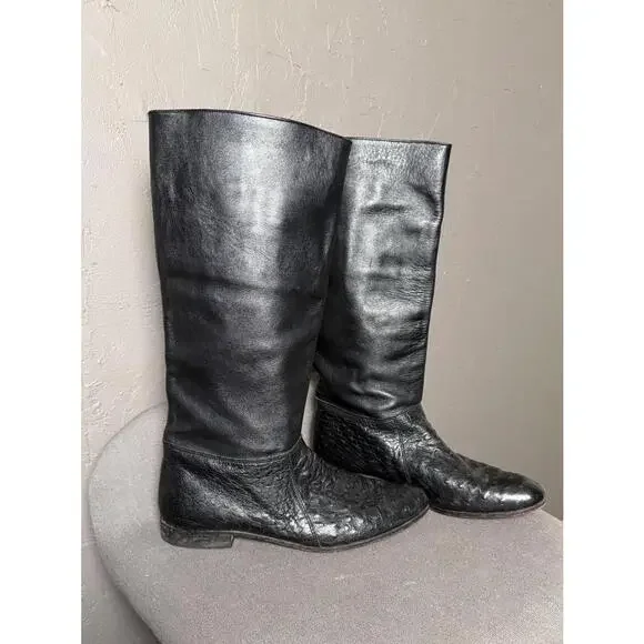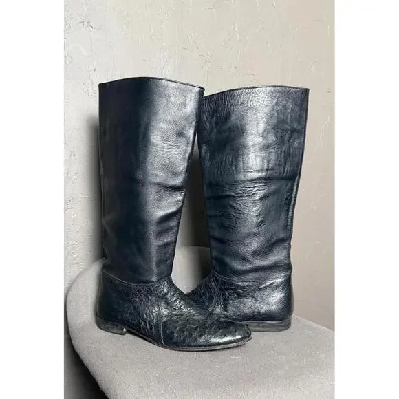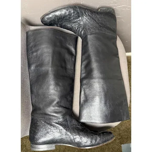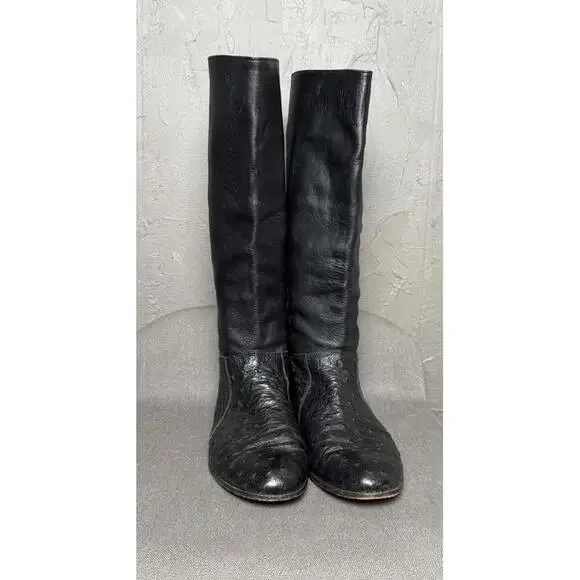 Vintage 1970´s-80´s Tall Boots. Maker/Brand unknown, size worn off. Please read full description for sizing/fit. These are very high quality. Black Ostrich Leather. Leather insoles and lining. Pull on. Classic "Ostrich" dot textured leather below the ankle and a smoother but still lightly textured leather on the shaft. Almond shaped toe. Low Heel. In Excellent condition with light wear, only really noted at the soles which still look to have plenty of wear before having re-soled. I´m guessing these to fit a women´s 8-8.5. I wear a 9-9.5 but can get my foot into an 8.5 wearing a thin sock. Please compare measurements to a similar style in your closet and message for any help/tips. Measurements taken at outside and bottom of boot.Heel-Toe : 10.75"Heel Height : 0.75"Width @ Arch : 2.25"Width @ Ball : 3.5"Shaft from Arch : 14.5"Around Top of Shaft : 15.5"Please message for any additional details or for help with sizing/fit. Ships in 24 hours (or less) from purchase.