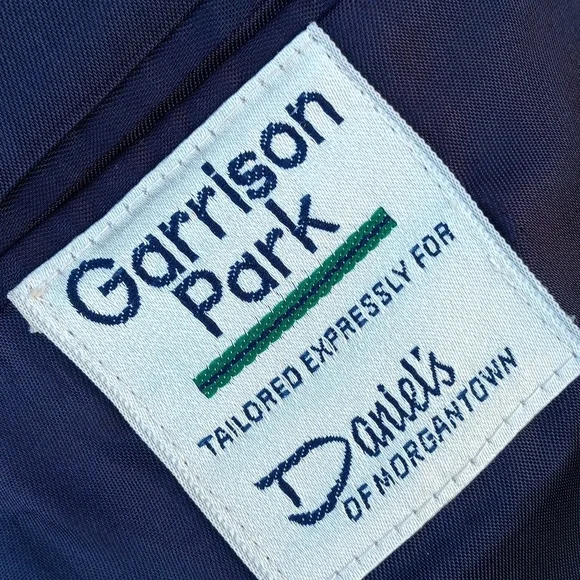 GARRISON PARK MEN´S VINTAGE PURE WOOL NAVY BLUE BLAZER W/GOLD BUTTON ACCENTSExperience refined elegance with this "Men´s Garrison Park Navy Blue Gold button Accented Classic Blazer Jacket" from DANIELS of Morgantown. This meticulously crafted piece combines classic design elements with modern sophistication, offering a versatile addition to your wardrobe. With its tailored fit, two-button closure, and attention to detail, this blazer jacket exudes timeless style and impeccable craftsmanship.Extremely well tailored Gold Button Accents Medium Weight Fully Lined TAILORING Shoulders 22"Armpits 26.5"Sleeve Length 28"Jacket Length 35.5"*Excellent Vintage ConditionTailored Exclusively for Daniel’s of MorgantownSELLING QUALITY MEN’S CLOTHING FOR OVER 50 YEARSDaniel’s of Morgantown specializes in high-quality suits and men’s fashion—along with the latest WVU sportswear. We offer high-quality brands such as Hart, Schaffner & Marx, Jack Victor, Empire, Cutter & Buck, Southern Tide, Tommy Bahama, and Rodd & Gunn. We carry a wide selection of shoes by Allen Edmonds, Cole Haan, and Johnston & Murphy. Our sales associates have been in the industry for over 30 years. We have a master tailor on staff to customize any garment to your taste.