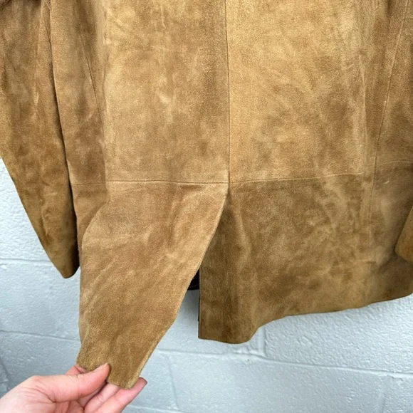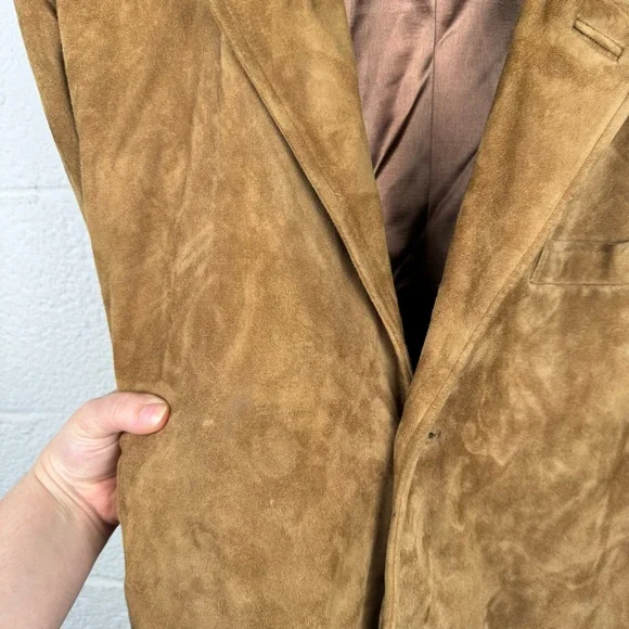 Experience tailored perfection in sumptuous, butter-soft suede: our jacket featuring classic notch lapels and two front patch pockets.-100% Suede-Professional Leather Clean-ImportedIn great preowned condition. One small mark found on there underside of right arm and on the right chest (both pictured and very minor. Can probably be cleaned if taken to professional)Measurements in last photos.