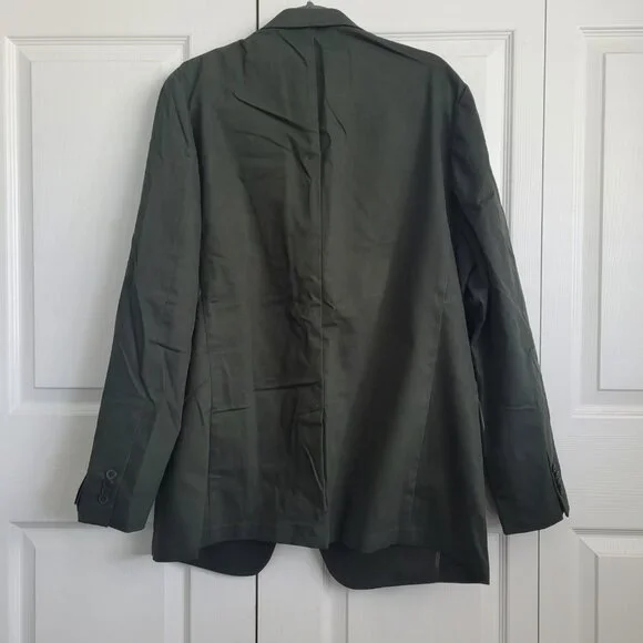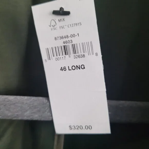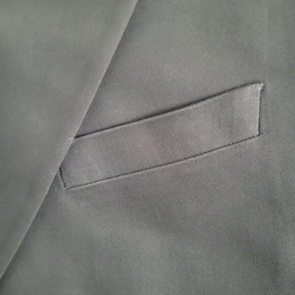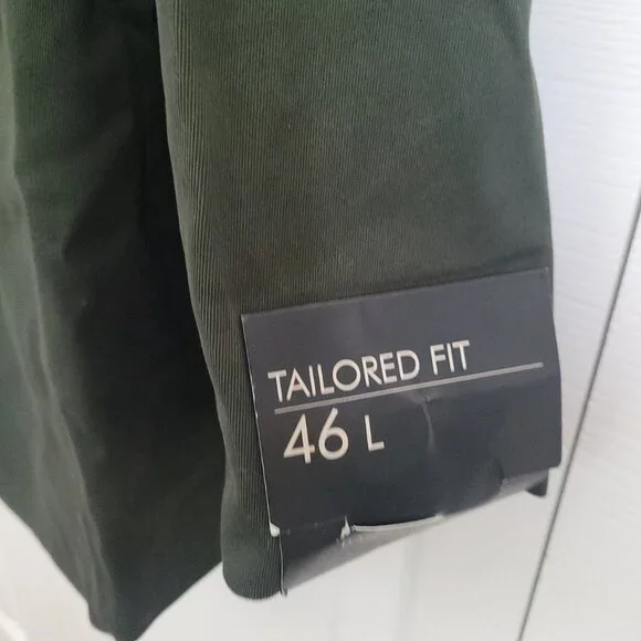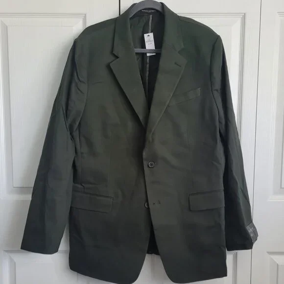 NWT BANANA REPUBLIC Men´s Chino Suit Jacket in Olive Green, Size 46L. This brand-new, never-worn men´s blazer combines modern tailoring with casual versatility. Crafted from premium chino cotton fabric, this unstructured suit jacket is perfect for both business-casual and smart-casual occasions. Features include a two-button front closure, notch lapel, dual back vents, and multiple functional pockets. The olive green color offers a contemporary twist that works great year-round—ideal for office wear, weddings, date nights, or elevated weekend looks. A classic wardrobe staple with a modern fit.