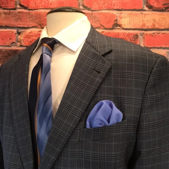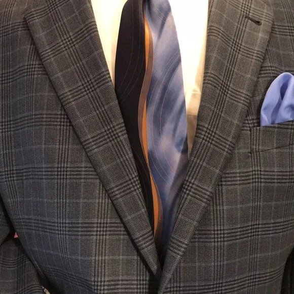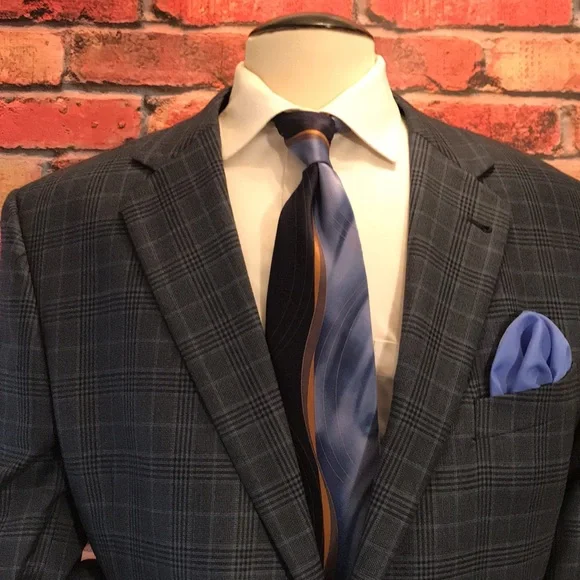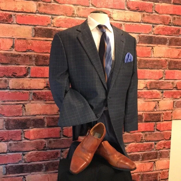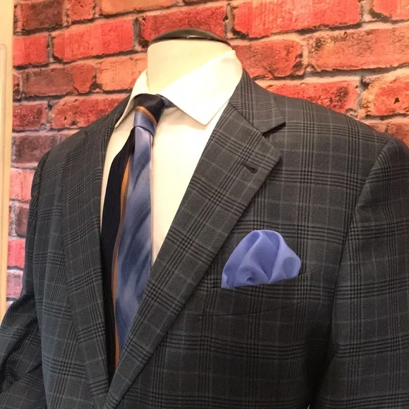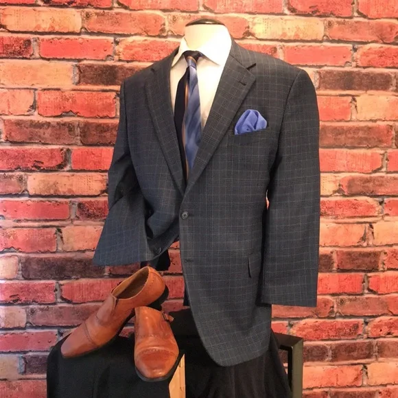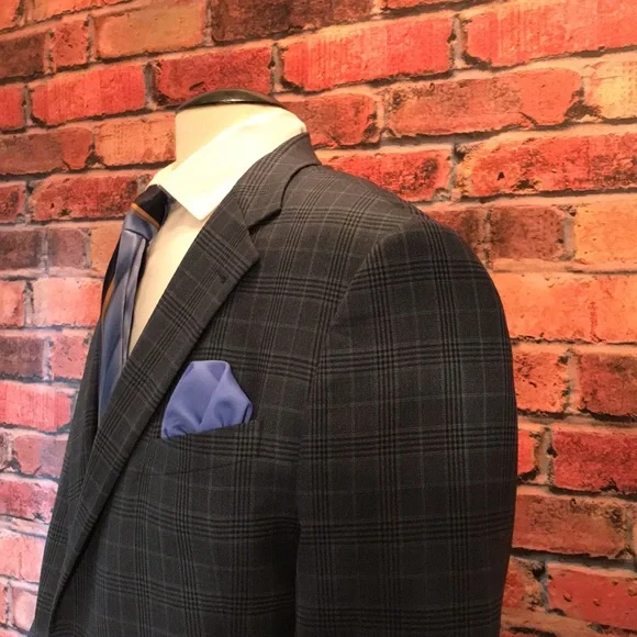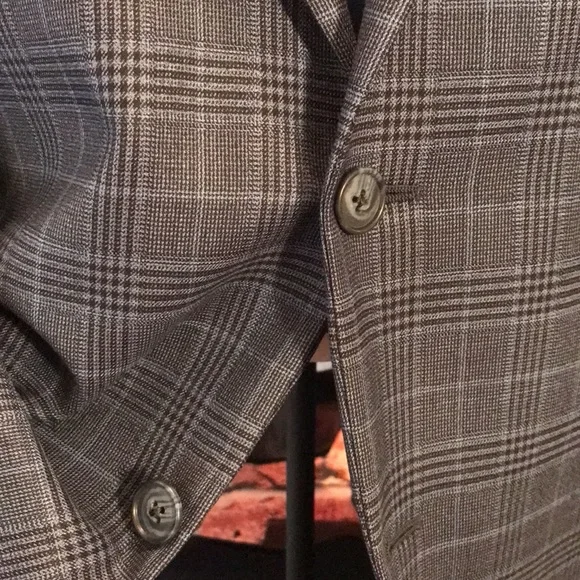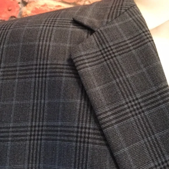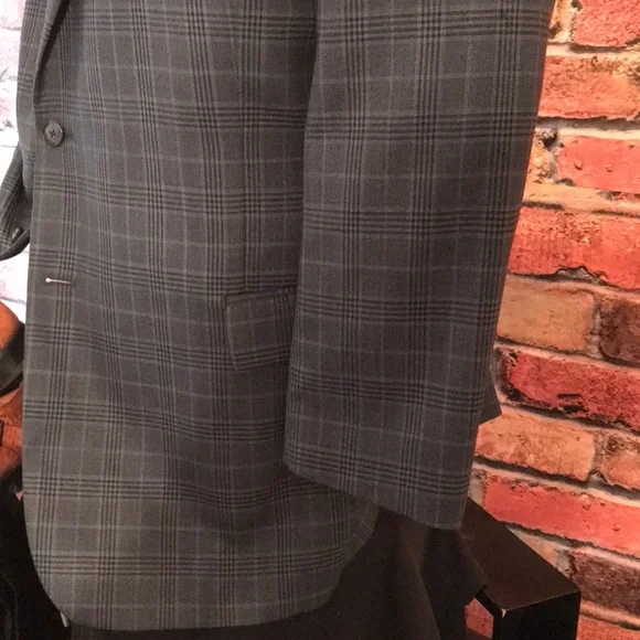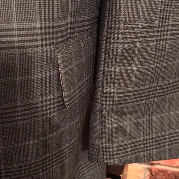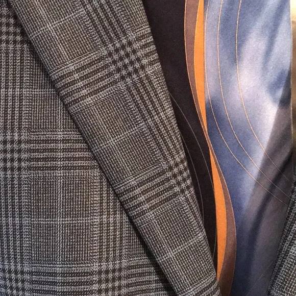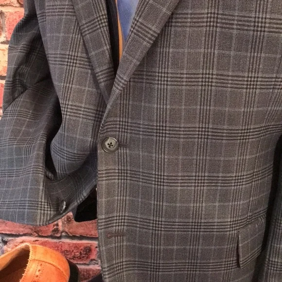 Selling this elegant only worn once Abboud Sport Coat size 48 Long colors blue black gray plaid design it’s 100 % lightweight wool all season fabric, fully lined notched lapel flap pockets 2 front buttons and Side Vents. Perfect for business or office casual with jeans or khaki pants. Armpit 26 sleeves length 24.5 it’s tailored in the sleeves but there is 2 inches extra to lengthen. Coat length 32.5 shoulder 22 accessories and shoes Not included Only the sport Coat. Mens Wearhouse price $599