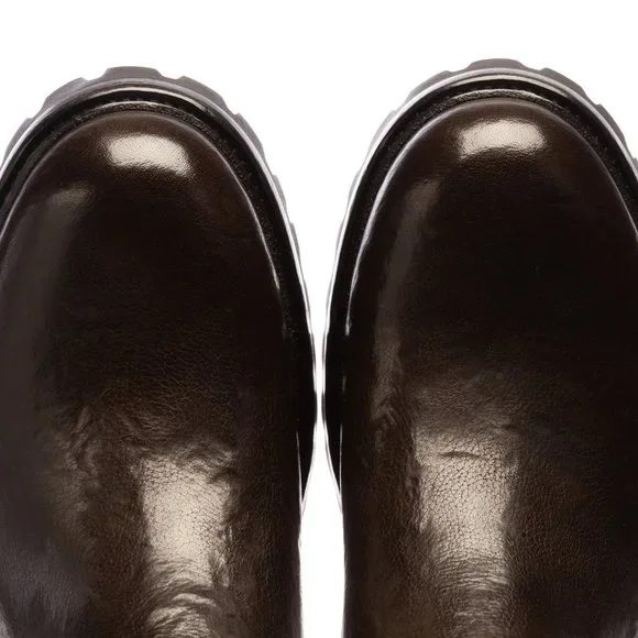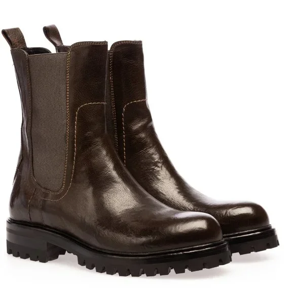 Ducanero’s Fashion forward Chelsea ankle boot in hand stone washed leather.Item Code: 3378Color: BrownAnkle boot in washed calf leather and elasticLining: LeatherRubber SoleHeel...