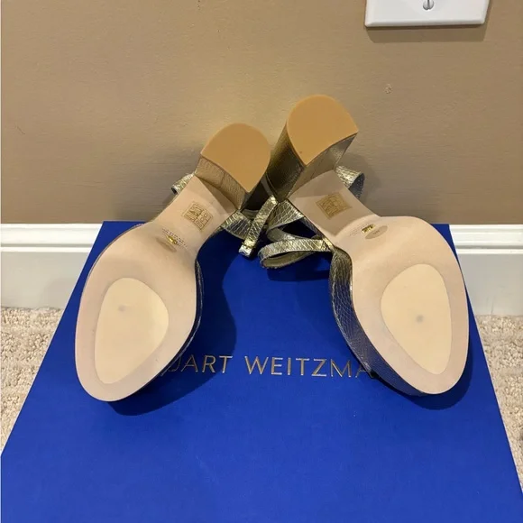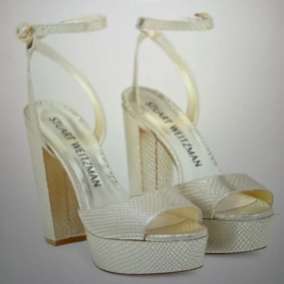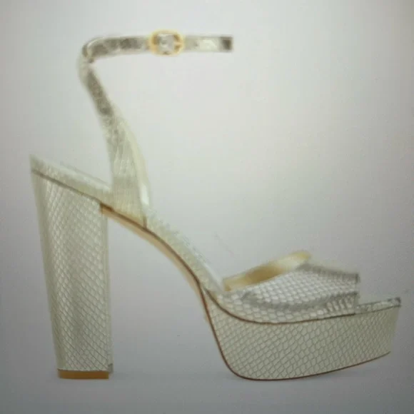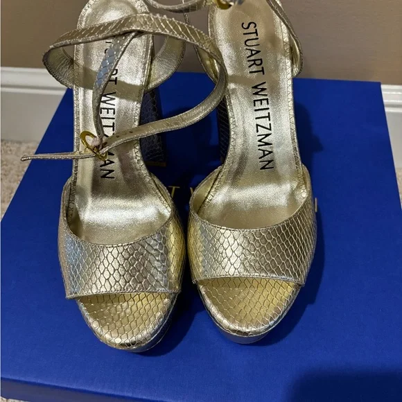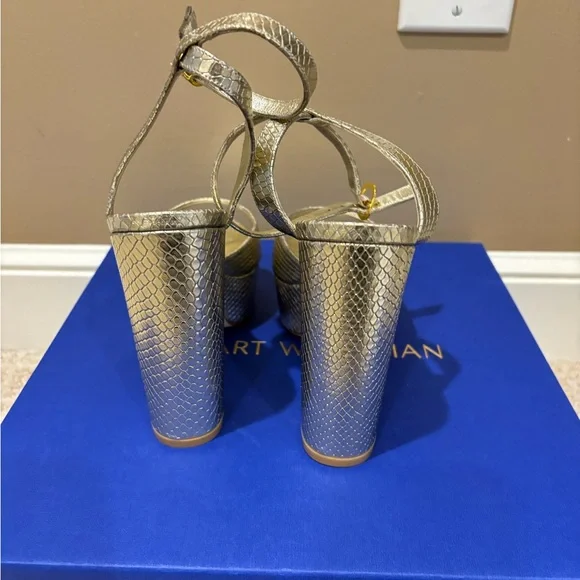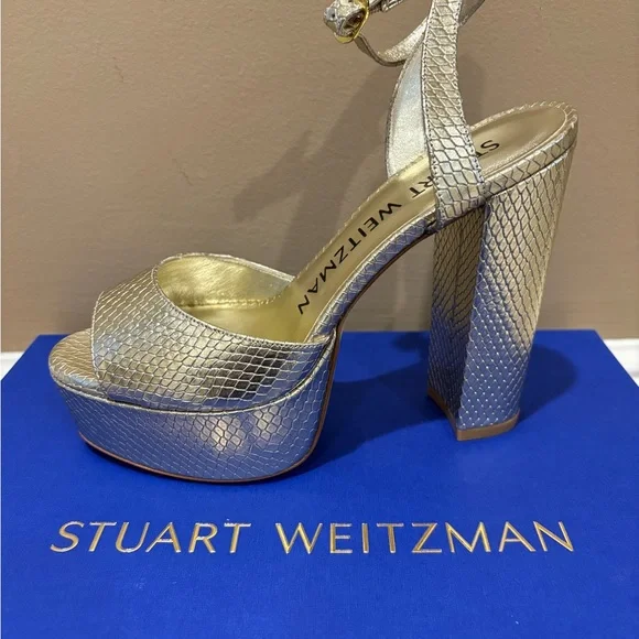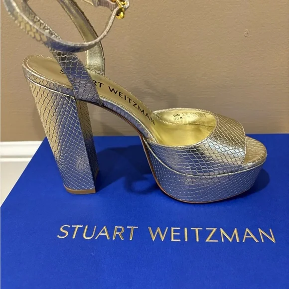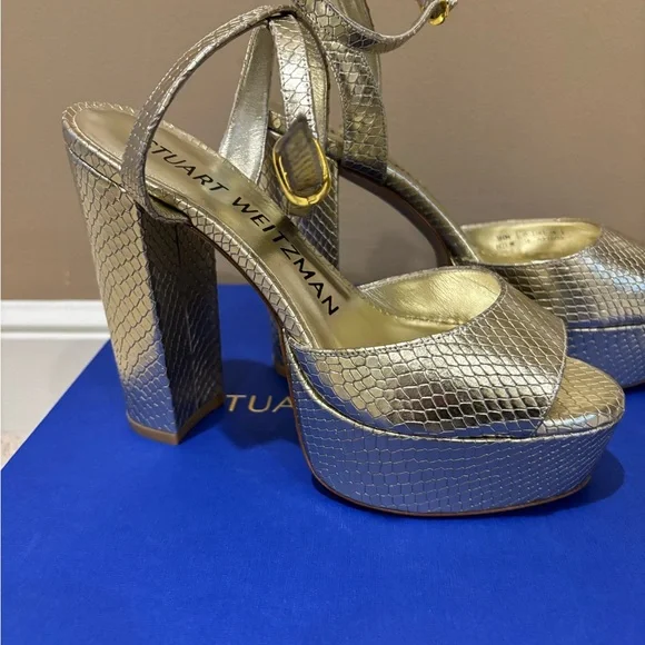 Stuart Weitzman Ryder II platform, sandal, metallic snakeskin, embossed leather heel height 4.9 inches platform 1.6 Ahto platform adjustable ankle strap, leather in and out soul size 5 brand new inbox with box and desk bag