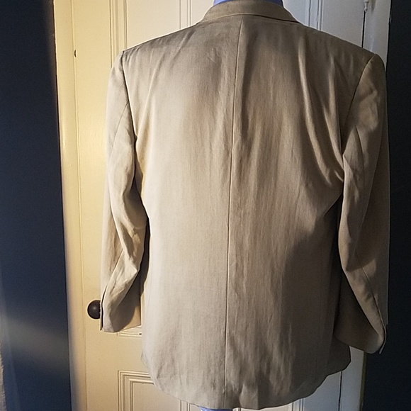 This two piece suit is 100% tencel it is very very breathable. It´s a 44L, and is tan in color. This is a very nice suit. Measured flat coat:44L23"chest,20"shoulder,24"sleeve,33"length.Pants:42"length29"inseam 38L waist.A092