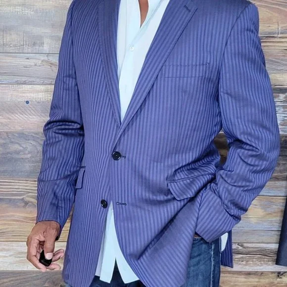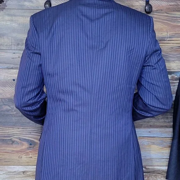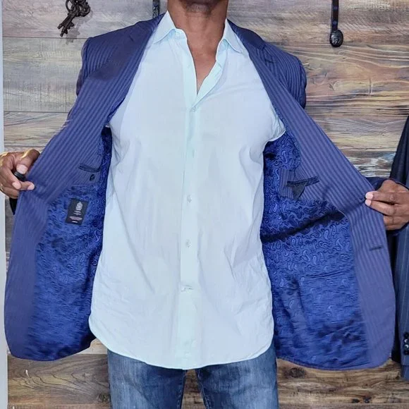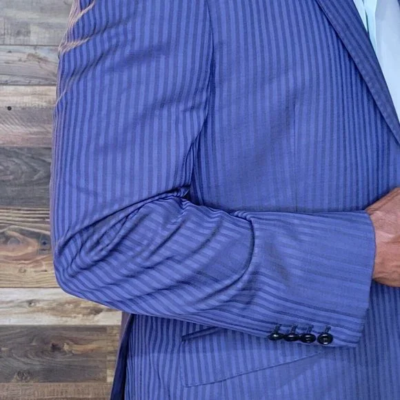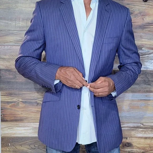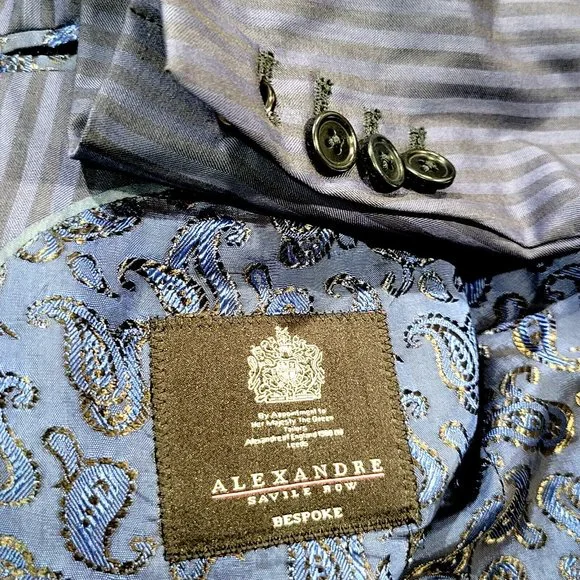 Alexandre Savile Row Bespoke Working Cuffs Stitched Lapel Super 100´s Blazer 40RExcellent ConditionDETAILSDesigned & Made in Size: 40R Size Comments:General Comments: Excellent Condition, Please review the measurements provided below. DetailsModel: 2-Button front closure, Dual rear ventAppropriate to wear:Summer, Spring , Winter & FallFabric content: woolColor/Pattern: Blue/StripeInterior pockets:3Lining: fully lined, Blue Paisley satin MeasurementsPit to Pit: 21 1/2”Shoulders at widest point: 18 1/2"Sleeve length from top of shoulder: 27"Length from bottom of collar: 31"