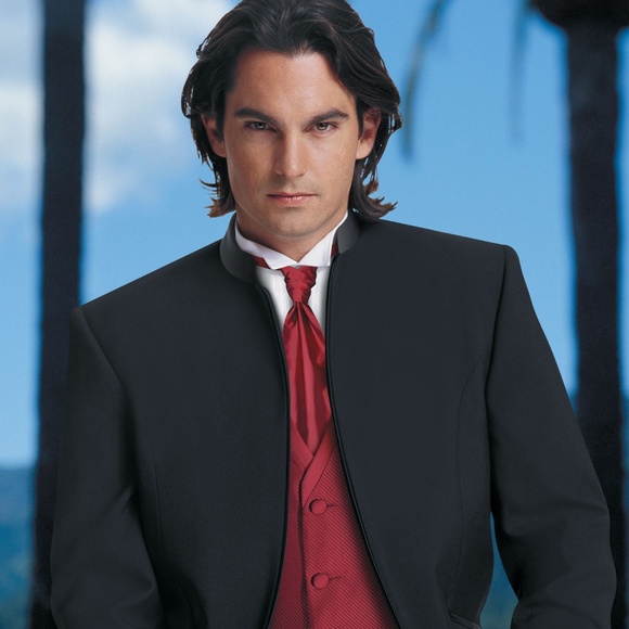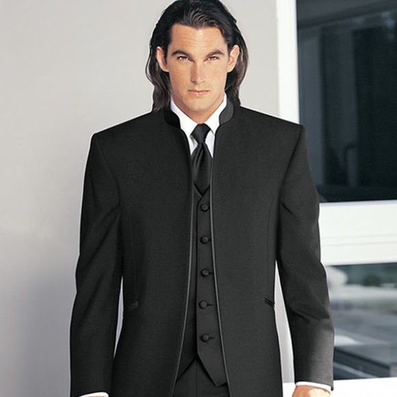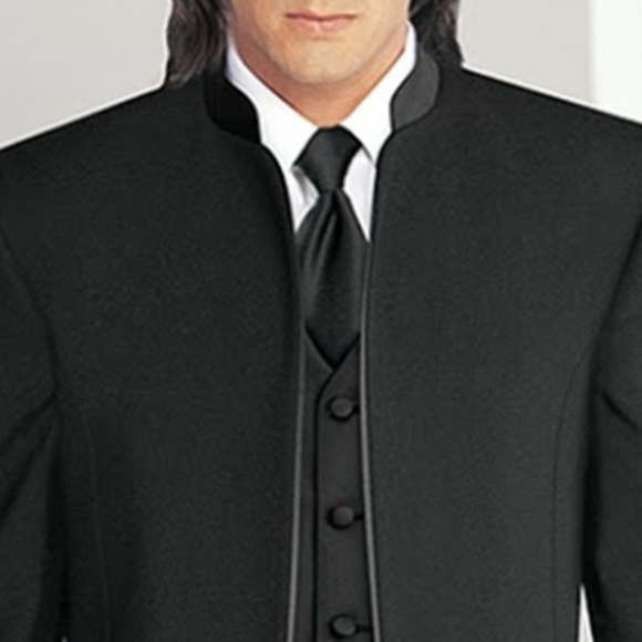 Brand NEW with the Tags OFFICIALLY LICENSED Jean Yves Mirage No-Button solid black Mandarin Collar tuxedo Coat in 100% All Season Wool.Suitable for any climate. Longer Length. "Regular" Sizes measure 35.5" from top of the collar straight down the back, to the bottom of the coat.Tuxes never worn, are clean, and not irregular in any way. Auction is for ONE set of tuxedo coat-only. Should be able to wear with any solid black pants. Matching Pleated Pant or Vest/Tie Available for +$39