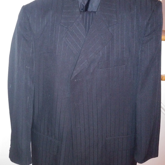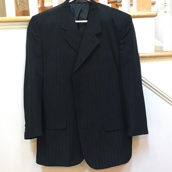 Has been altered. Some extra fabric is included. Double vent. 3 exterior pockets, 3 interior pockets. No visible flaws, tears or stains. Excellent used condition. Gorgeous Suit!!No size label, but measures like 38R Measurements laid flat: 17.5” shoulder to shoulder 21” armpit to armpit20” waist above pockets31” long (below collar to hem) 26” sleeve length Smoke free, pet friendly home Tags: wedding, event, party