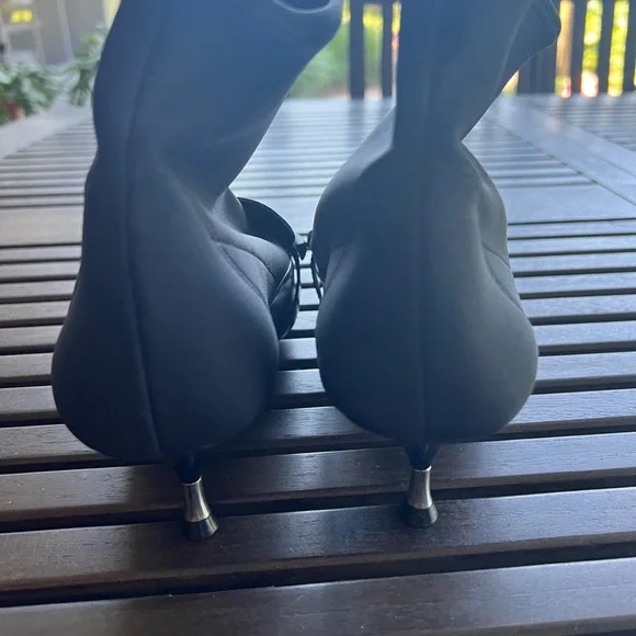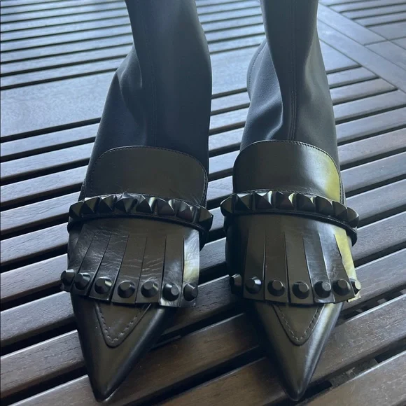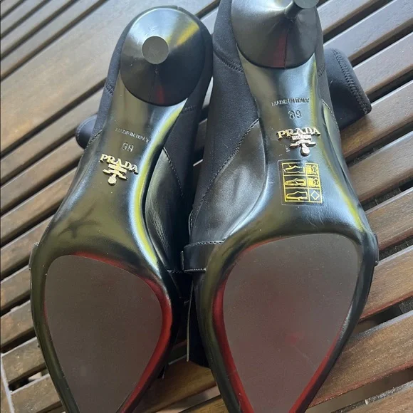 Authentic, worn once, Prada half sock loafer leather boot. They are a size Euro 39 (US 8.5) as you can see from pictures. Slips on, solid black and comprised of high quality leather and neoprene. Very detailed with cutout leather design flap and accents. Heel accented with silver metal as you can see from pictures. The one picture of the bottom of shoes looks like some red trim but that it just the reflection. There is no red on them. They are just stunning! Selling for my friend and she does not have box as she bought them when she was on a cruise and wore them once.