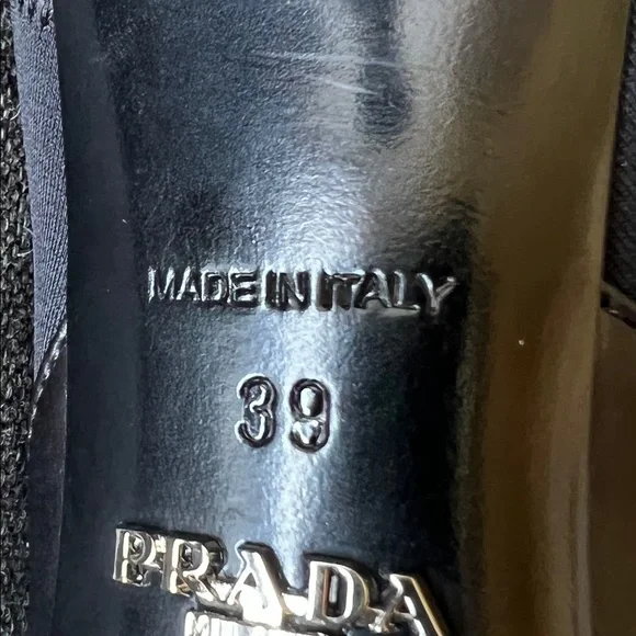 Authentic, worn once, Prada half sock loafer leather boot. They are a size Euro 39 (US 8.5) as you can see from pictures. Slips on, solid black and comprised of high quality...