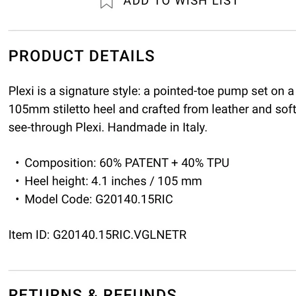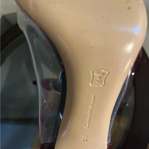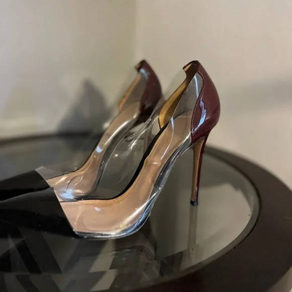 Just needs a wipe down cleaning , no box included.Black, burgundy and clear colorPlexi is a signature style: a pointed-toe pump set on a 105mm stiletto heel and crafted from leather and soft see-through Plexi. Handmade in Italy.• Composition: 60% PATENT + 40% TPU• Heel height: 4.1 inches / 105 mm