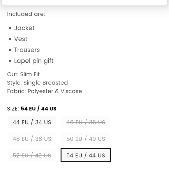 Bought on gentleman´s crate a year ago for $249 for our wedding and didn´t get around to returning it when it didn´t fit. Size US 44, but is cut skinny. It is...