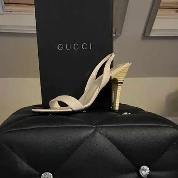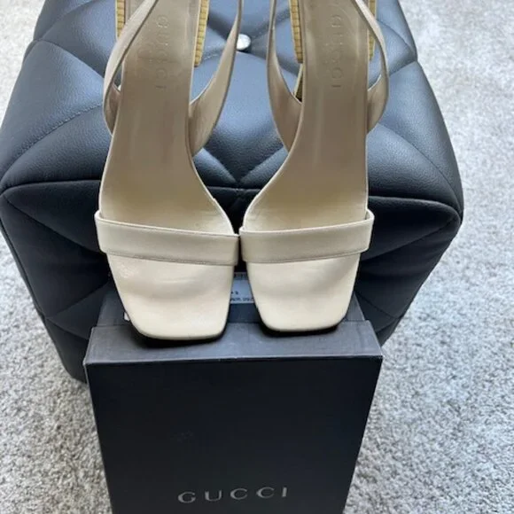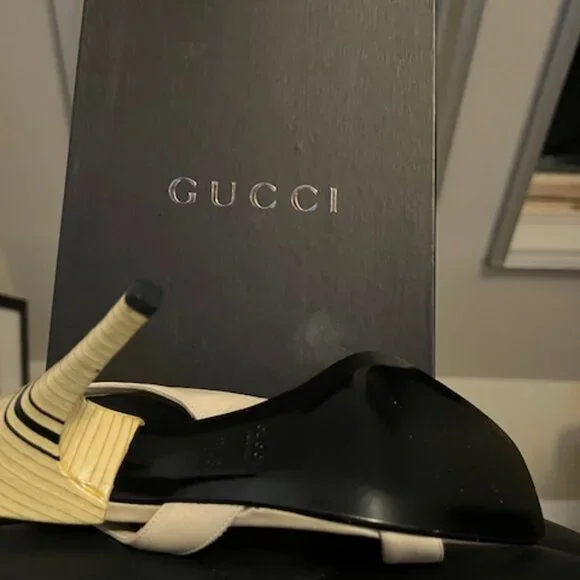 Like new sling back sandals size 6.5. Beige with black stripe on the heel.Worn once to an indoor event.