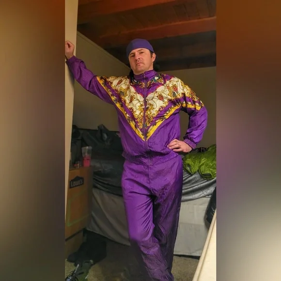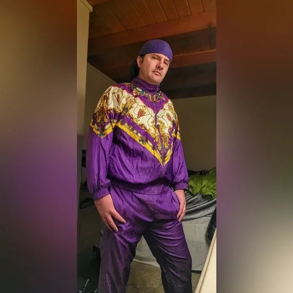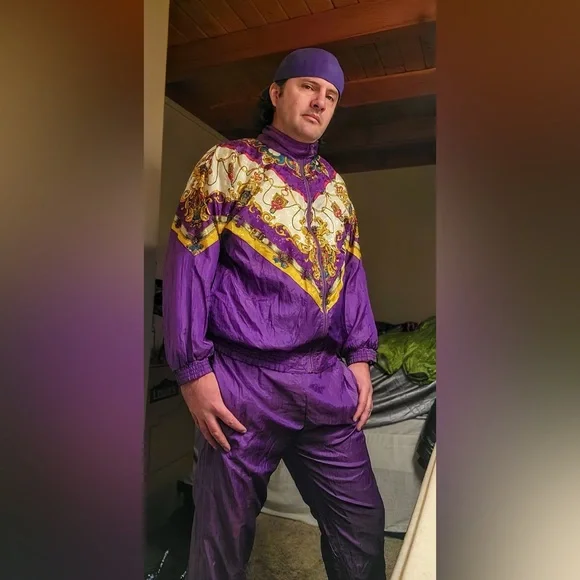 Stand out with this vibrant purple shellsuit featuring intricate patterns. Perfect for adding a pop of color to your wardrobe.