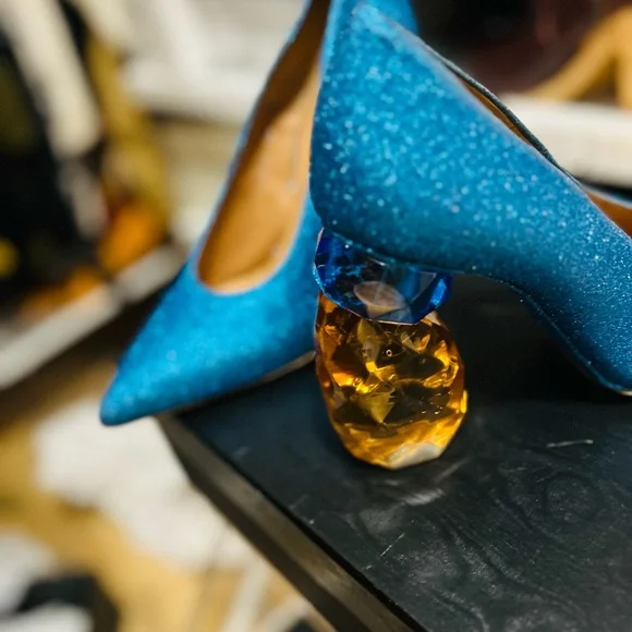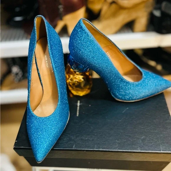 These striking high-heeled shoes feature a vibrant blue color with a glittery finish, a classic pump style with a pointed toe, and a high stiletto heel for an elegant and glamorous look.