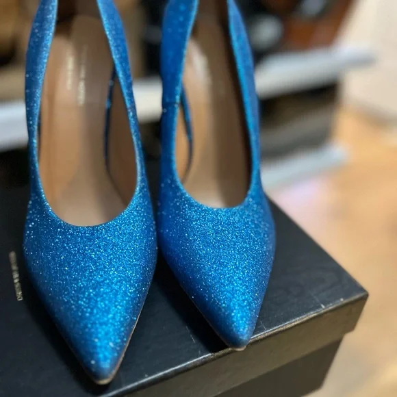 These striking high-heeled shoes feature a vibrant blue color with a glittery finish, a classic pump style with a pointed toe, and a high stiletto heel for an elegant and...