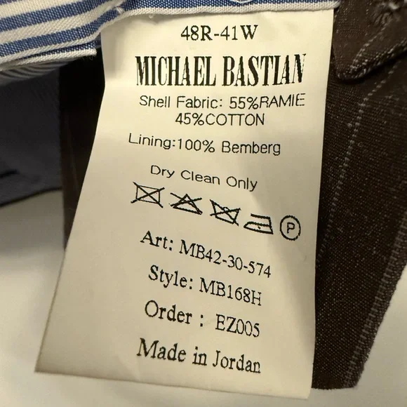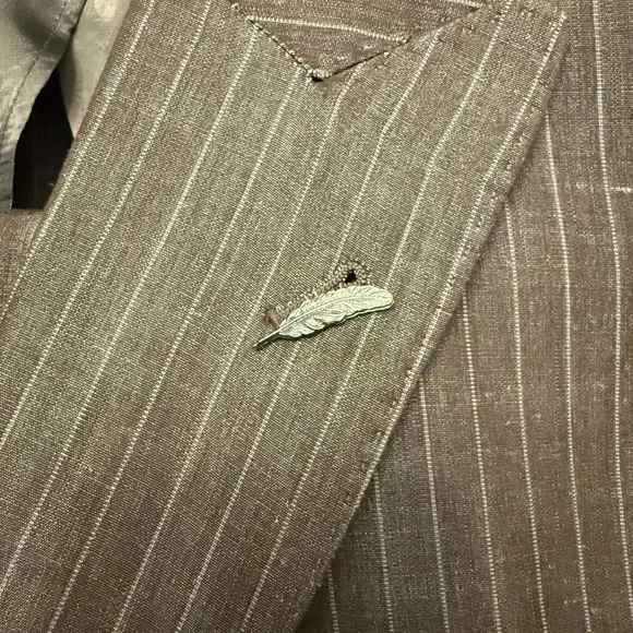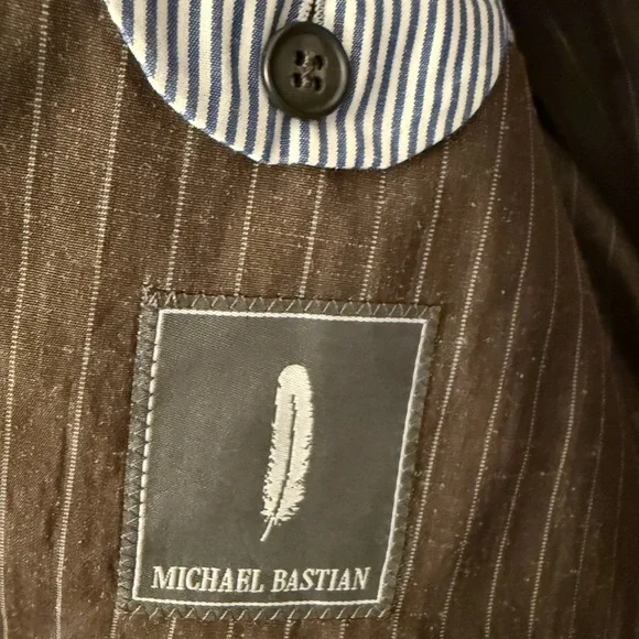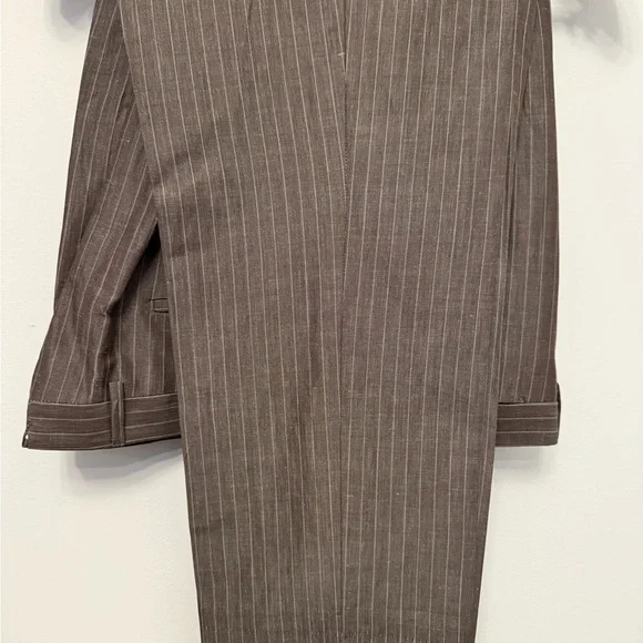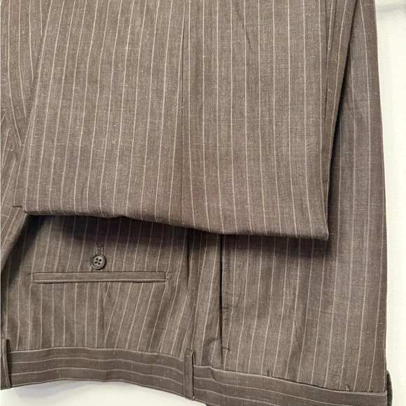 This Michael Bastian suit in a sophisticated Brown Stripe hue features a double-breasted design with wide peaked lapels and structured shoulders. Crafted from a premium Linen 100%. it offers a timeless silhouette perfect for business or formal occasions. Brand new without TAG pants size is 38/32.