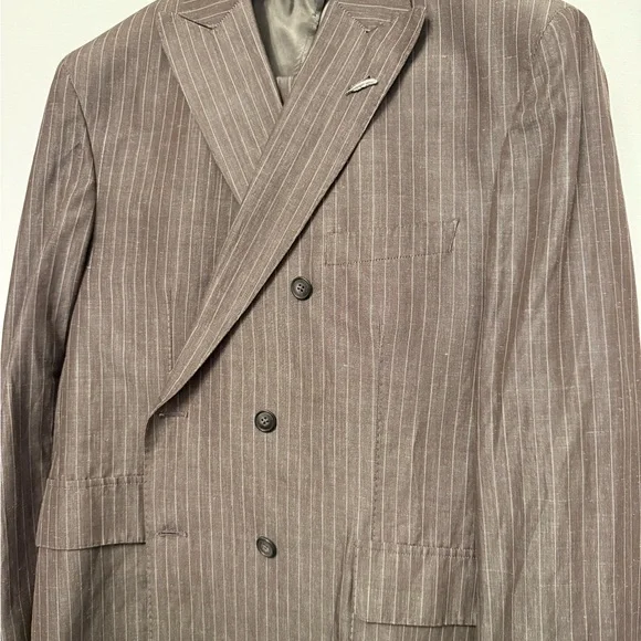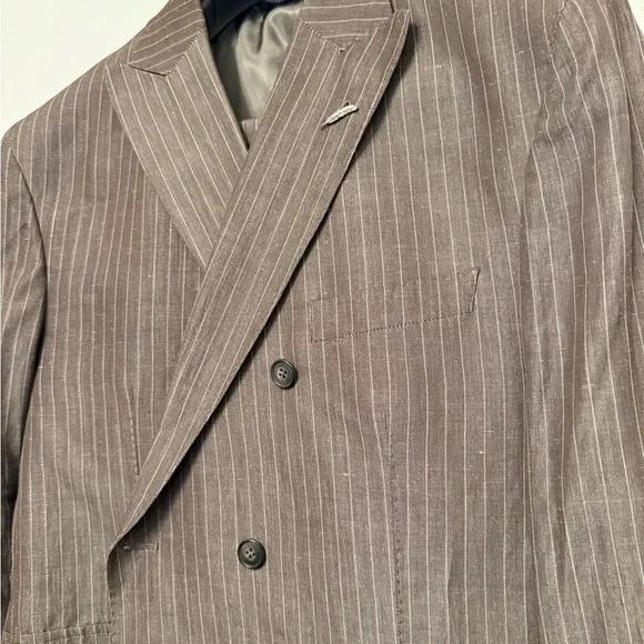 This Michael Bastian suit in a sophisticated Brown Stripe hue features a double-breasted design with wide peaked lapels and structured shoulders. Crafted from a premium Linen...